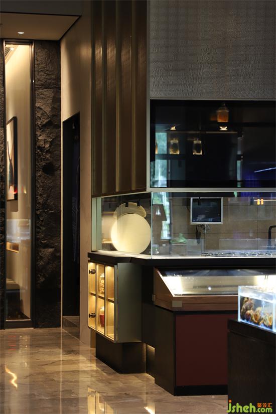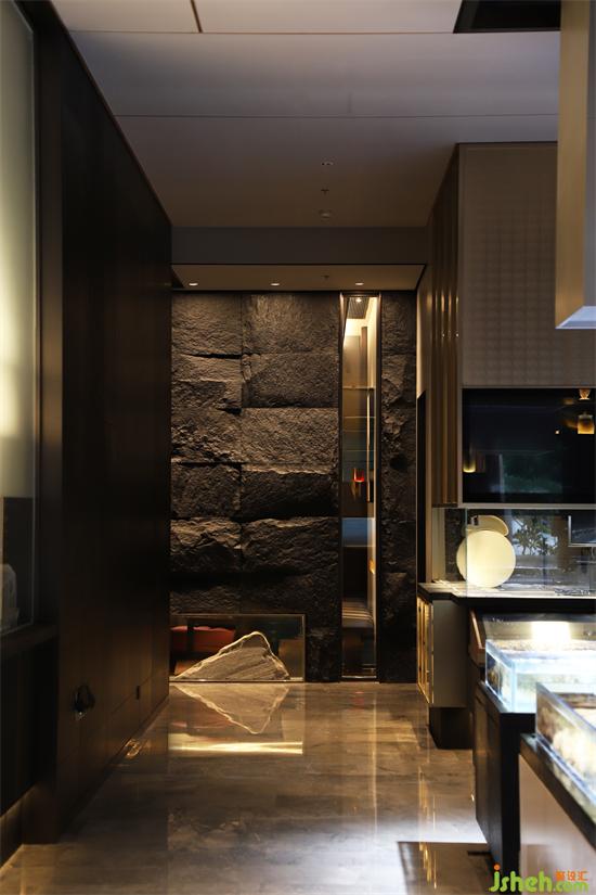 穿行过道,尽头处“过海见山”呈现本案山海徐来的理念,徐记海鲜餐厅设计师选一角页岩摆件,置入透明塑料保护罩中,搭配反光的地面和顶部射灯形成“山峦与它的倒影”。