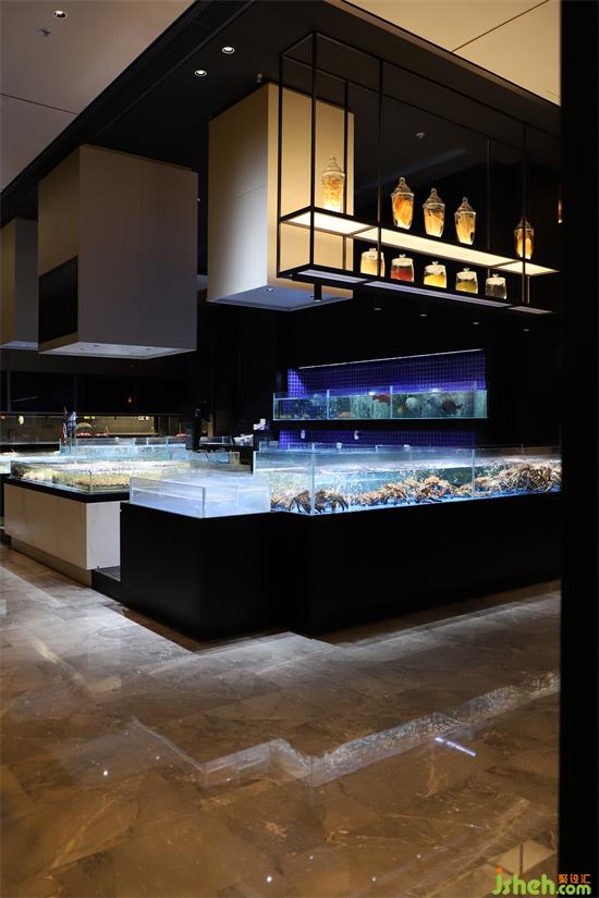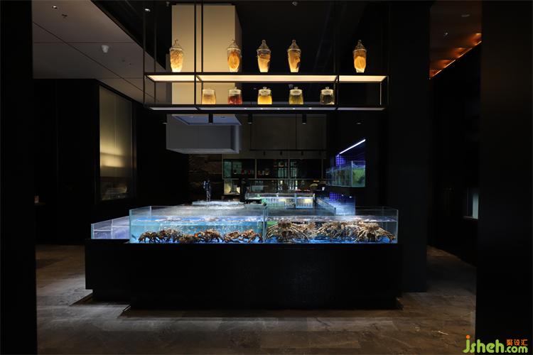 海鲜岛上方天花在色彩上与周边形成视线差,黑色基底营造深渊感,设备体块从顶部错落倒挂,徐记海鲜餐厅设计光线集中于吊架与海鲜池,目光由此聚焦。