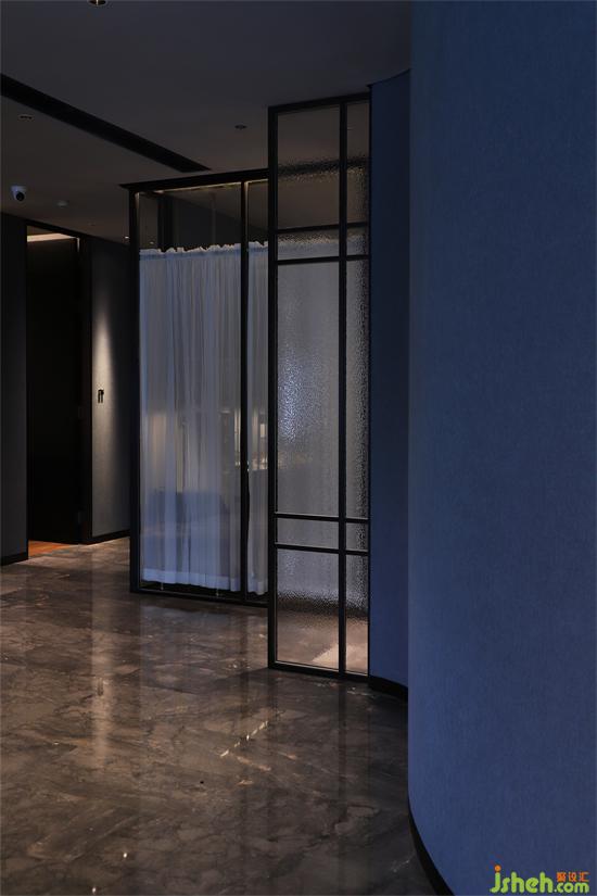 廊道弧形墙面与玻璃隔断层层递进,金属框架配合拉花水纹玻璃的运用,徐记海鲜餐厅设计给隔断增加第二层“透”,赋予走廊空间新的个性和面貌。