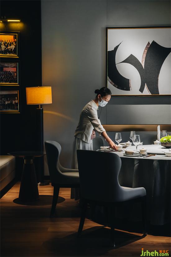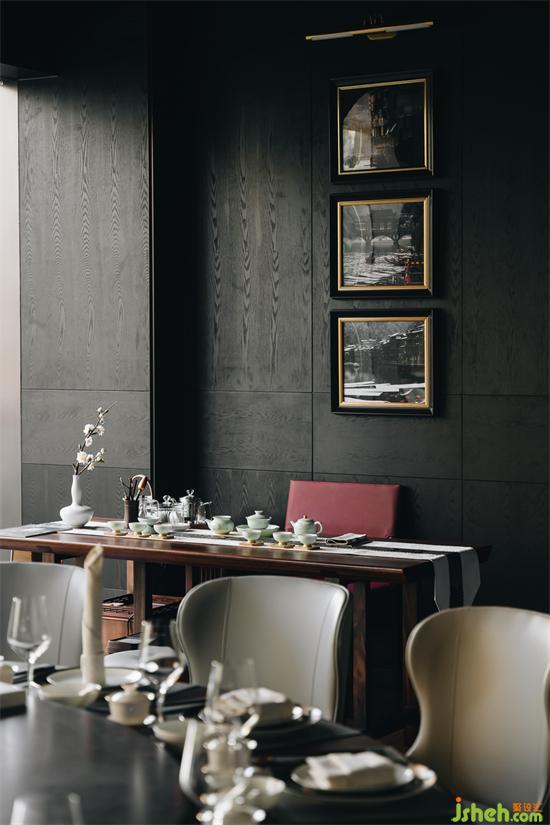 徐记海鲜老店照片被用作装饰画置于墙面,既是企业文化的传承,也是情怀与现代的完美交融。徐记海鲜餐厅设计定制的煮茶台和茶椅以红色为基调,搭配洁白的花艺瓶插和同色系茶具,满足商务宴请客人的品质需求。