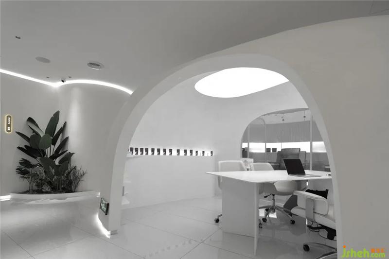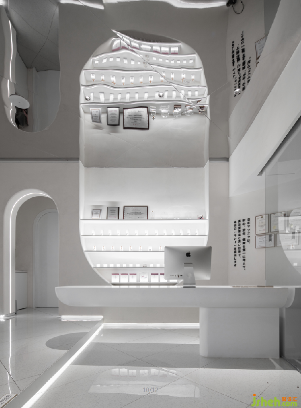 接待台的圆角、空间内分布的各种倒角的元素呼应品牌主题福州店铺设计