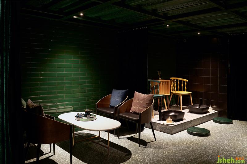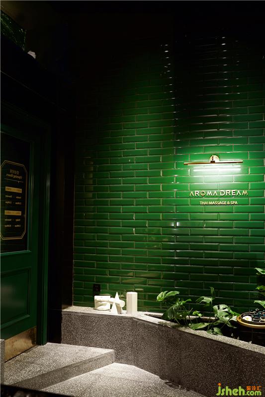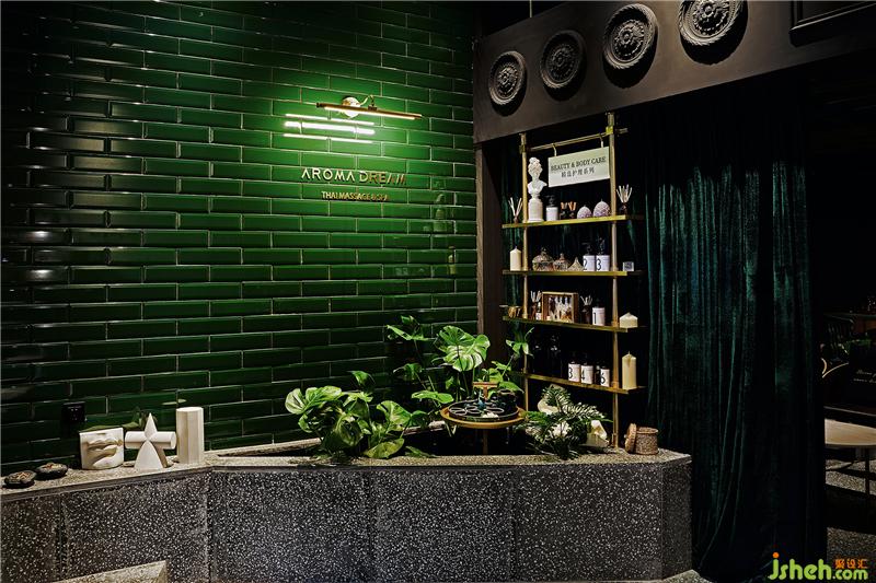 摆脱传统泰国东南亚印象,空间采用深沉的丛林墨绿为主色,墨绿色手工砖、祖母绿云石、热带绿植、墨绿色天鹅绒和墨绿透明膜的组合应用,在黑色背景衬托与黄铜、香槟金点缀下摆脱风格概念。公共空间里自然的声音与古典乐的混合,经历着热带雨林的心灵洗礼,还有采自泰国的本土纯正精油香气,自成一种与外面街道隔绝喧嚣的高级格调感,John巧妙把泰国雨林、水景、冥想与艺术融入其中,配合技师的古法技艺,营造崭新的泰国印象。