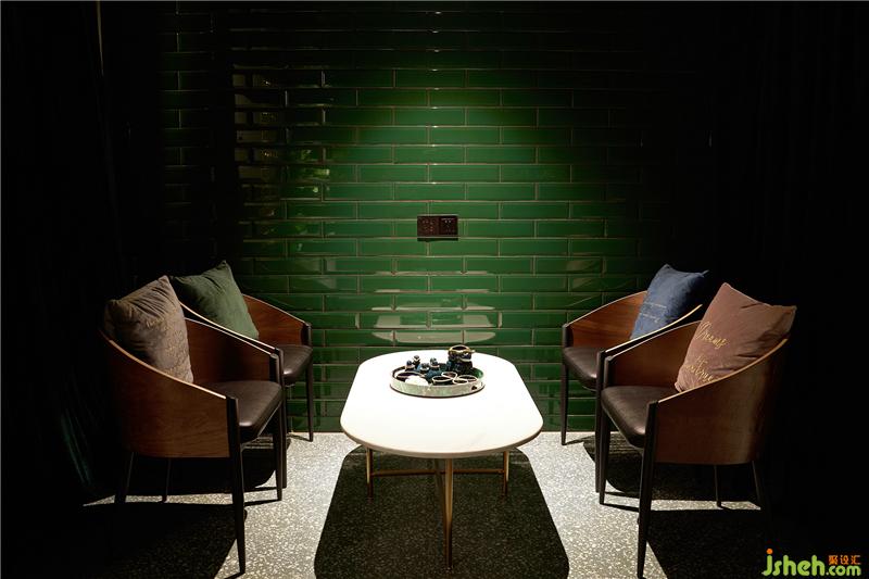 设计主要材料:灰色水磨石预制板/墨绿色复古瓷片/香槟金拉丝不锈钢/彩色呼吸光纤灯装置/黑色拉丝还锈钢/黑色鹅卵石/黄铜片/黄铜管