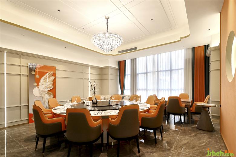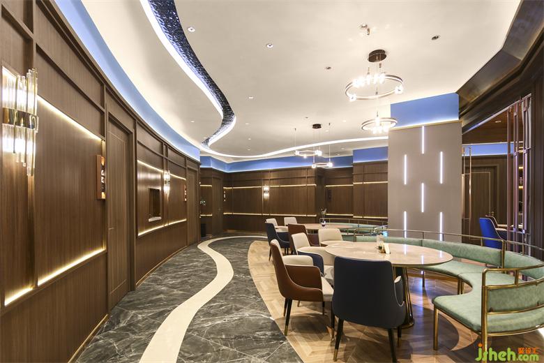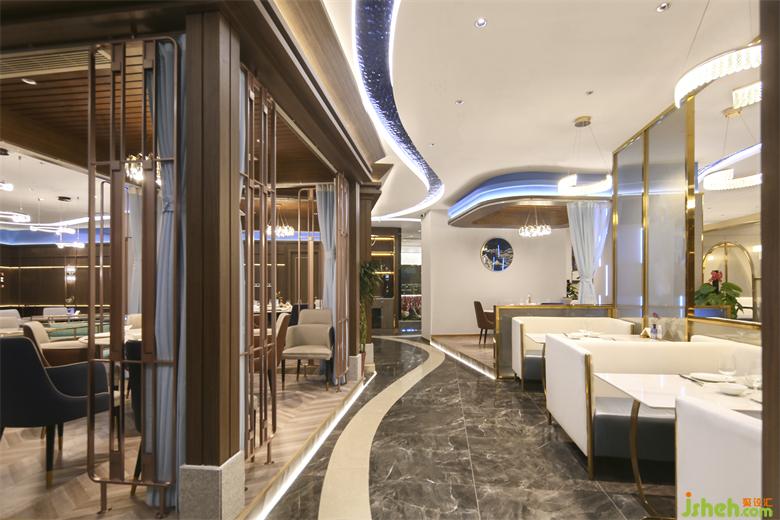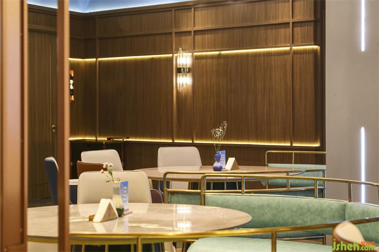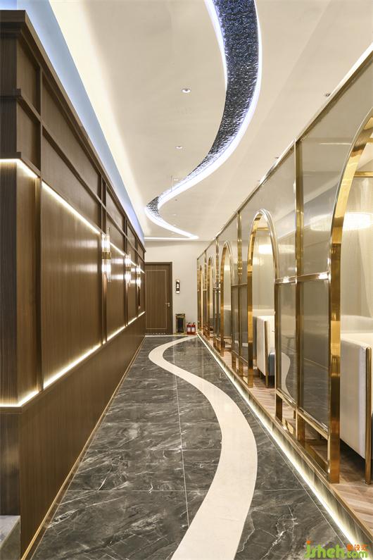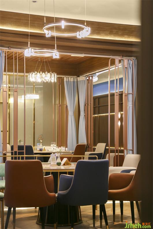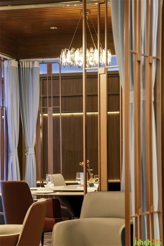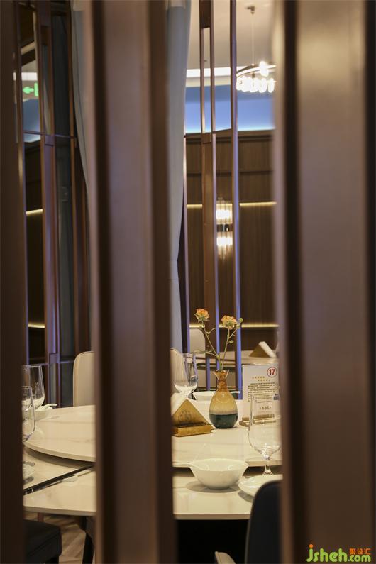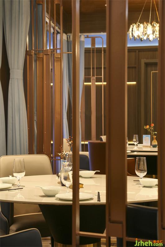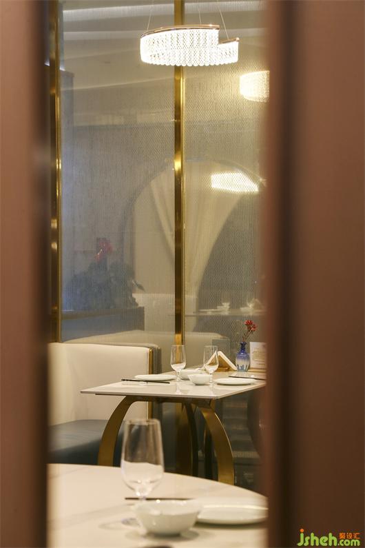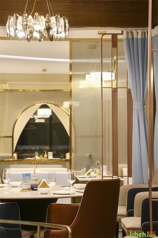 海鲜餐厅设计空间中的艺术屏风用黄铜混搭艺术玻璃,划分出每一个半包空间,承托着主空间的意境。同时,灰色大理石地砖,木质的装饰,白色餐桌等,这些装饰也呈现出浓郁东方情调的轻奢之感!