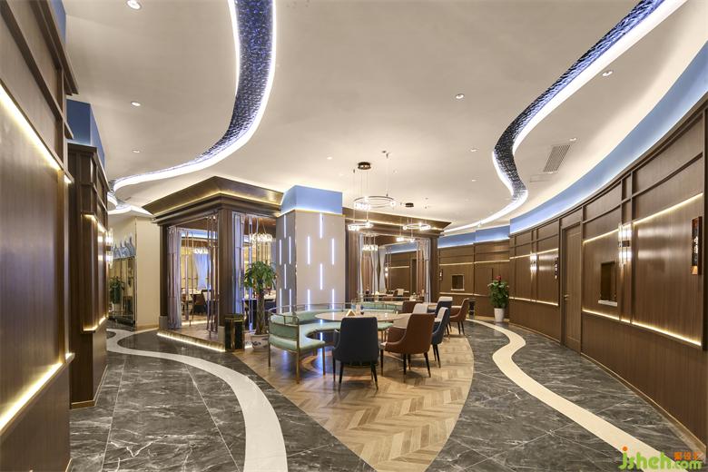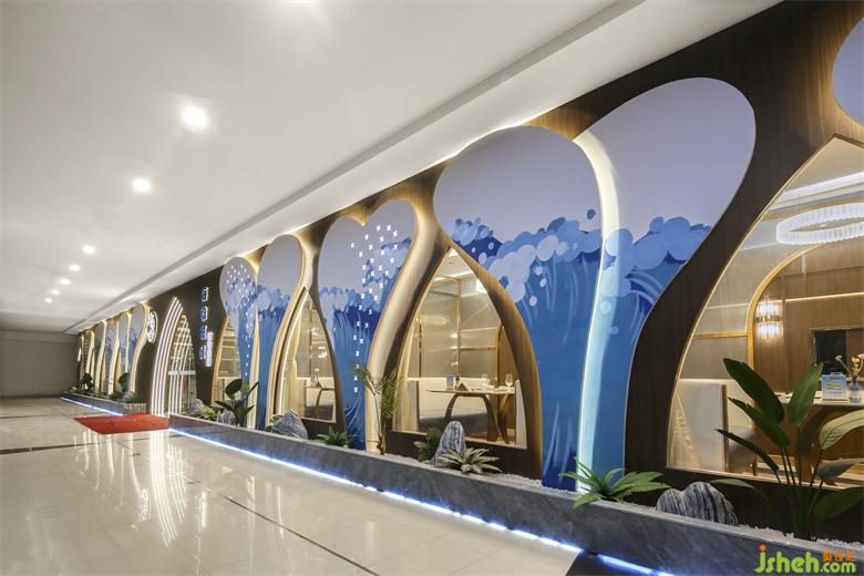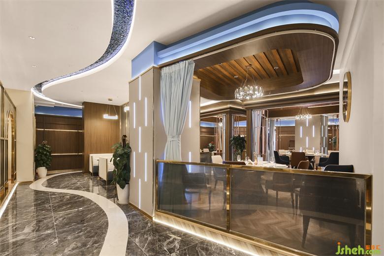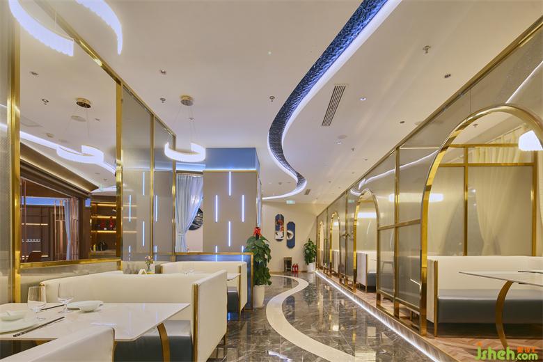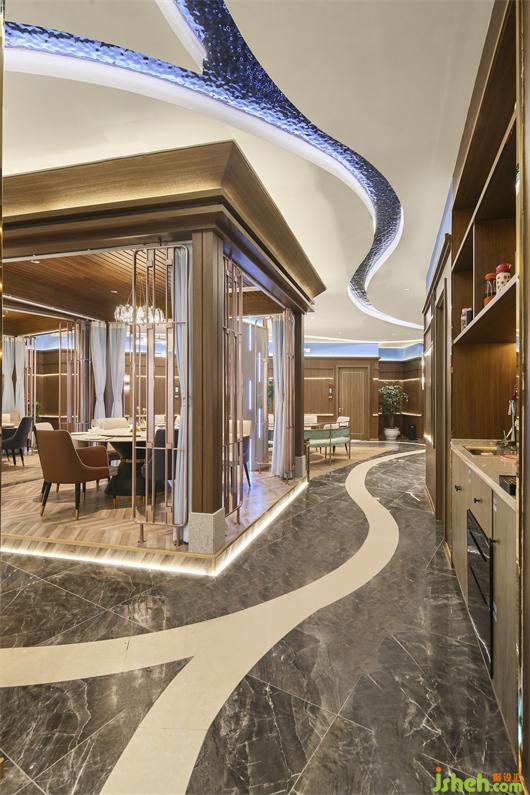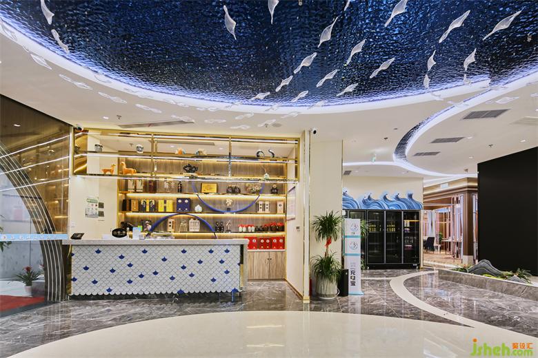 连接各个空间的廊道则由蓝色浪潮凝固成灵动蜿蜒的照明系统引路,“奔流”然后在视线尽处消失。海鲜餐厅设计绵延之水悬浮于头顶,指引着地下白色海岸地砖的方向,将一切笼于其下。铺陈开流畅的室内动线,共同铸就空间的内建筑感。