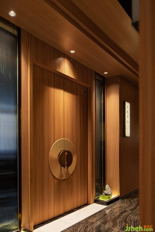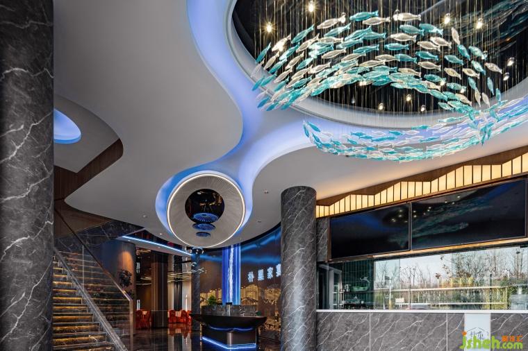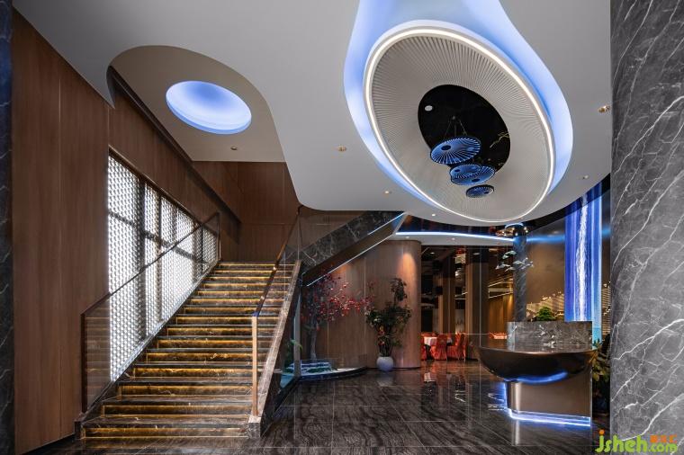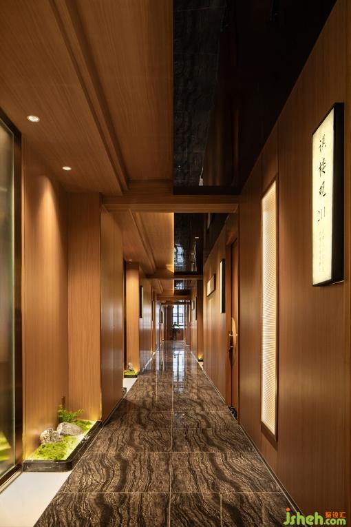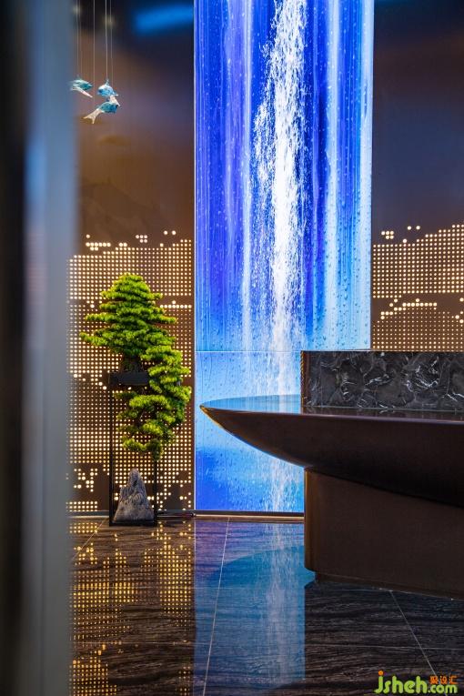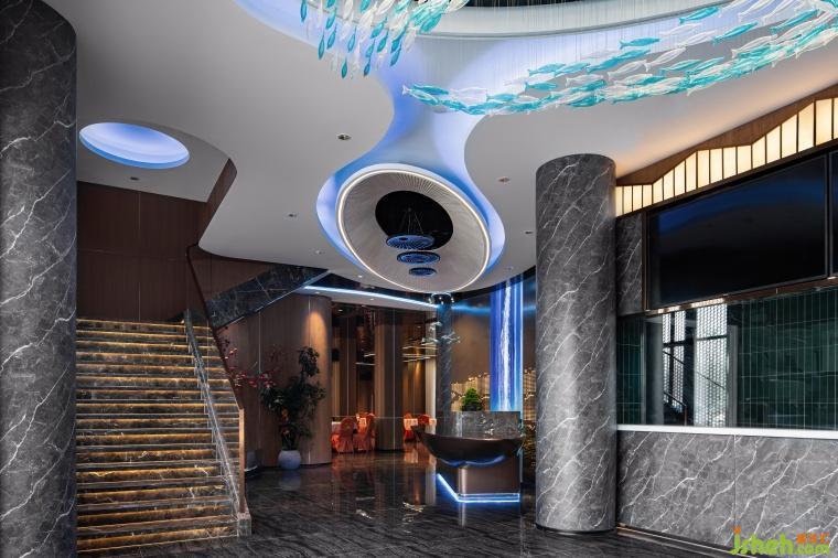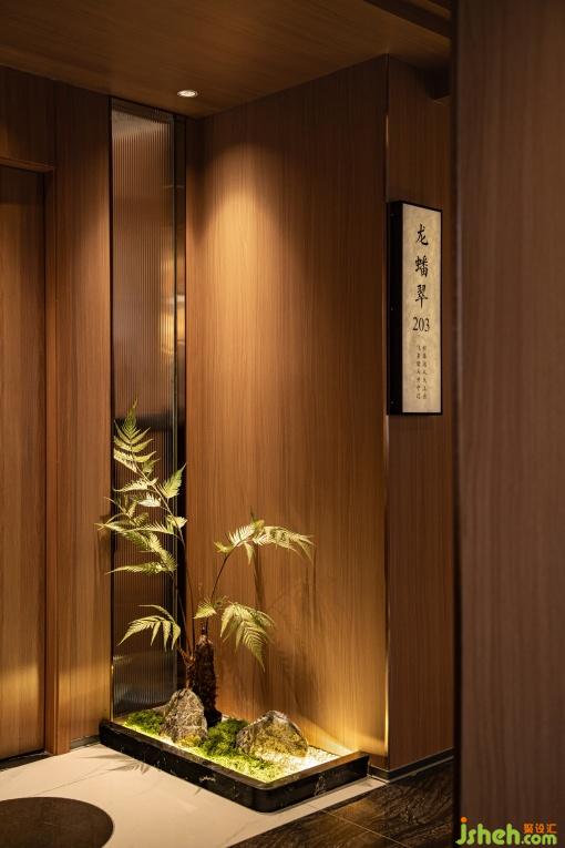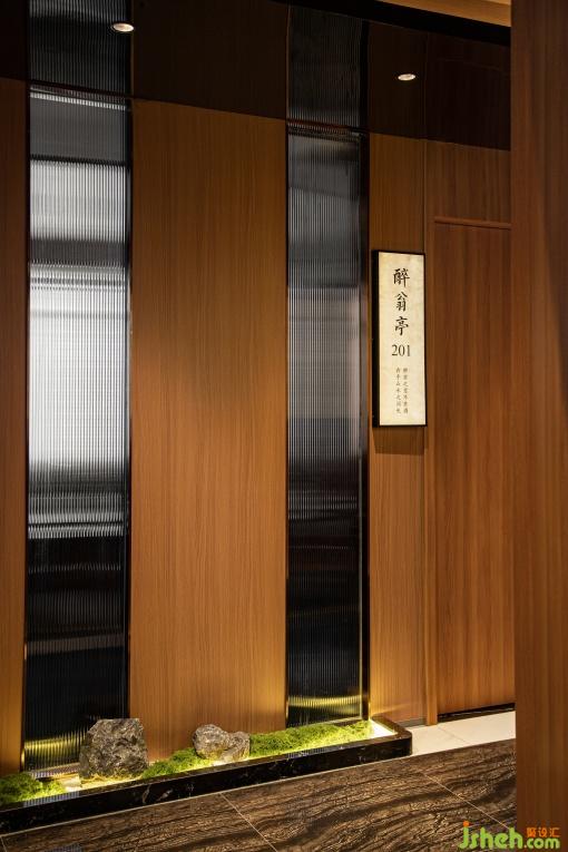 大厅的材质采用原木与石材结合,仿佛踏入琅琊山的山径。顶面的灯具模拟出了山泉水面的涟漪与游动的鱼群,生动描绘出了让泉的景色。大厅各处点缀了绿植与水景,营造了自然的氛围。
