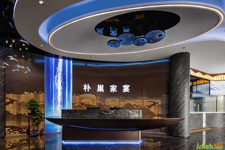 设计师巧妙的将滁州的自然风光融入空间。走进这里,仿佛瞬间穿越到了滁州的琅琊山。墙面星星点点的光,勾勒出起伏的山峦,呼应了《醉翁亭记》的首句“环滁皆山也”,为食客打开了一幅山水画卷。旁侧的瀑布屏幕,在灯光的映照下,仿佛能听到山间潺潺的流水声。