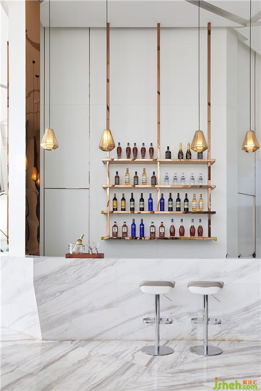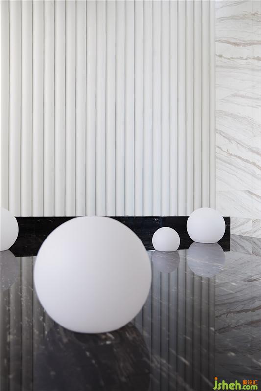 中空的球形吊灯象征着蒲公英一样追求自由,点缀整个空间的灵性,几何体的天花与灯光有创意的交接在一起,这些看似经典的元素创造出了一个 “动态雕塑”,单体结构在视觉上被打破成为碎片,充满动态感。