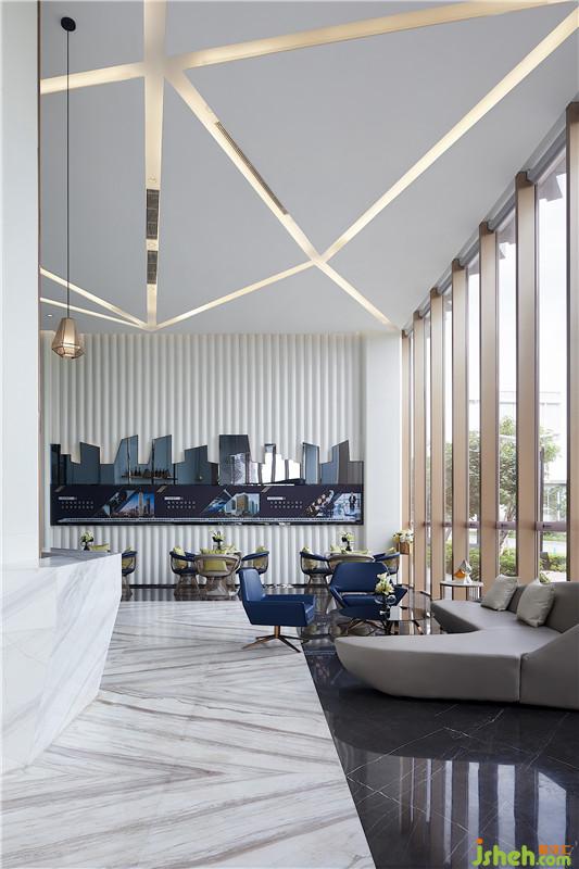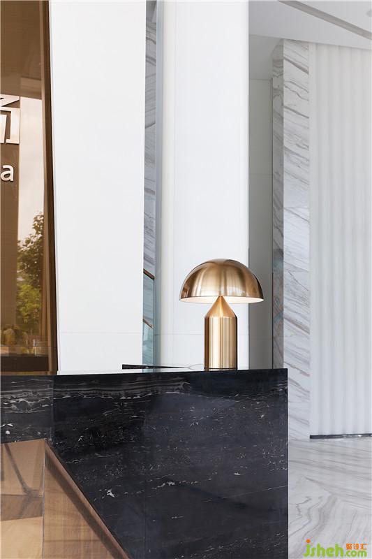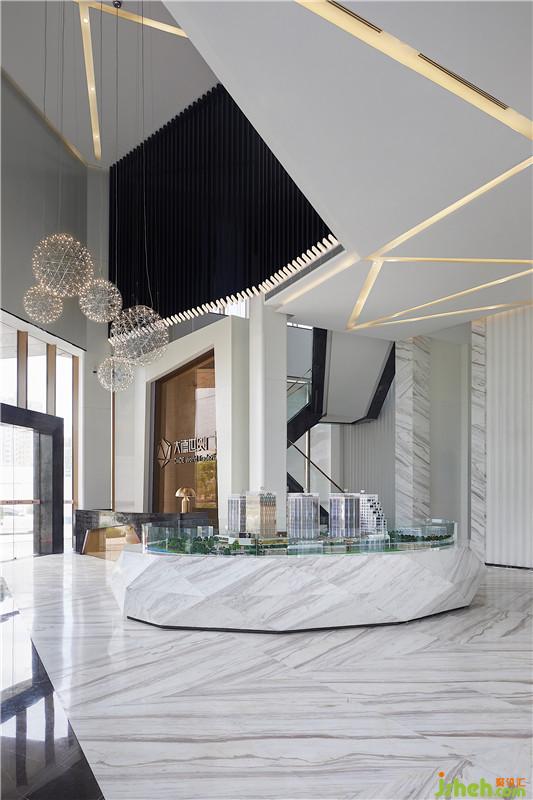 前台接待区作为售楼处的初步印象,用不规则的造型勾出利落线条感,把金属材质的镜面与抛光大理石结合,进行一场有趣的空间探讨。