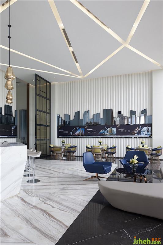 休息区运用巨型的落地玻璃和不规则墙面装饰,打造出律动的视觉效果,打破传统的建筑设计中的封闭式空间,大面积利用玻璃和金属等反光材质来化解建筑内的外界限。
