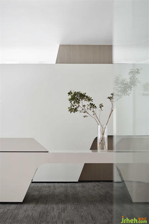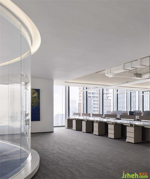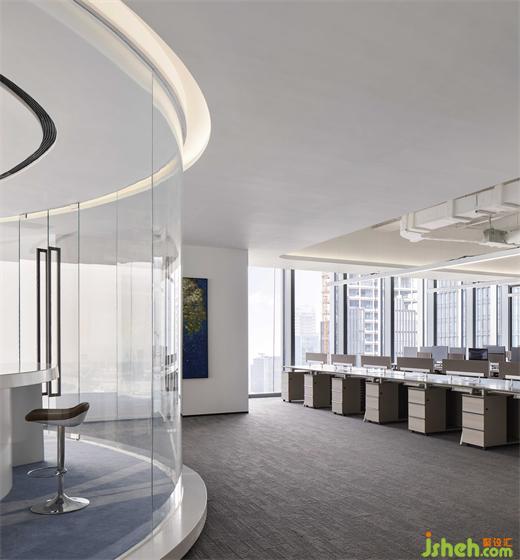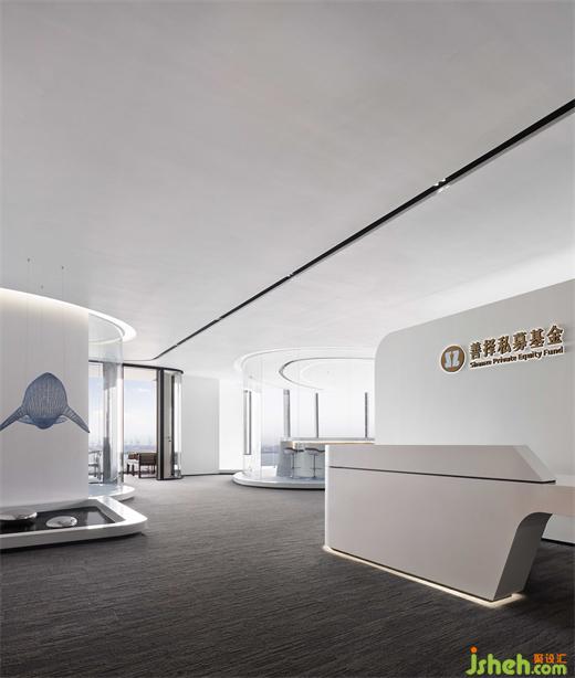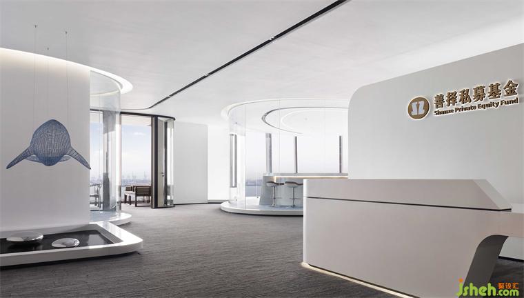 圆的递进、分布,在不远处牵引人们的视线。垂直嵌入的两个圆形装置,如鲸鱼吐出的水泡,善择基金办公设计以晶莹剔透的弧面玻璃为隔断,保留开阔空间的轻盈感,又丰富了层次,赋予空间想象力。