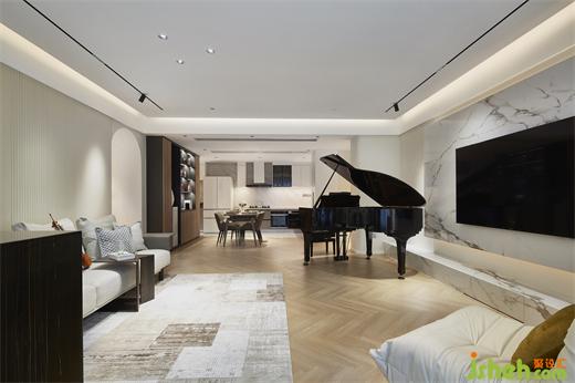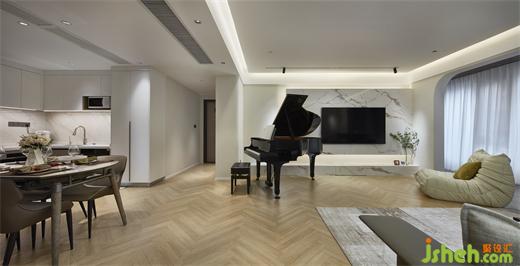 客厅的整体风格体现出了简约的美感,采用浅木色纹路地板,使得客厅更具线条亲和性。电视为大理石墙面挂式,不浪费空间的同时,给予了客厅更宽广的视野。背靠墙正对电视一式沙发,与茶台形成了L型的条理沉浸层次,棕白色相间格子地毯,装修设计使得客厅少了几分拘束拘谨,多了几分舒适温和感。深黑钢琴、大理石泼墨纹墙砖、静雅茶台、柔软沙发,满足了家庭成员的各种需求,使得客厅格调得到了至美升华。