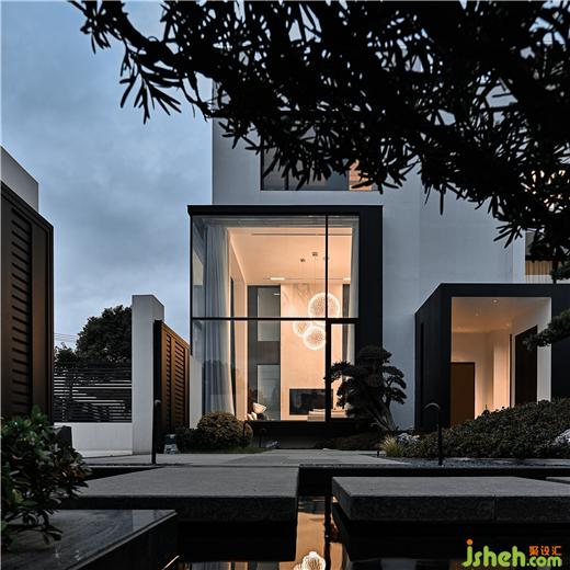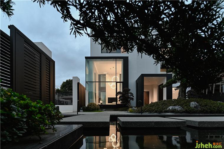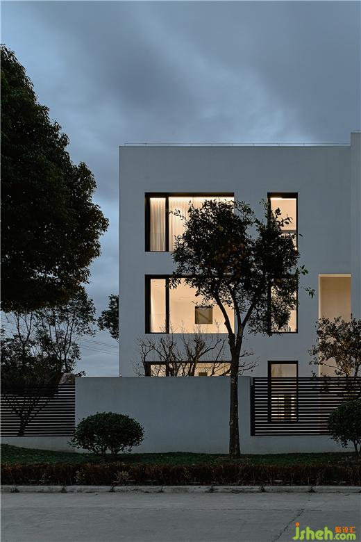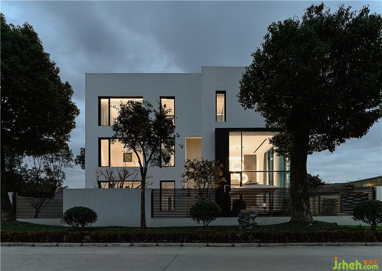 外部是平直的白色线条,内部是低饱和度颜色调搭配简单的几何空间,由此一来,这栋乡村住宅整体便具备现代极简的属性,别墅装修设计浸入中国南方的乡村环境中既突出又和谐。