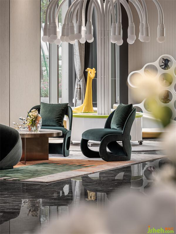 参观客户的长辈们在享受体验百万级的意大利沙发组合的同时孩子们已经被五彩缤纷及香氛气泡树吸引,这正是本项目的情景区间:“奇幻梦童话”,这里点石亚洲艺术组重新探索高段位的童趣空间,事实证明它不单打动了童趣的孩子们,也把家长们长期被压抑的色彩认知捅破,即并非黑白灰色调才是高范,营销中心设计讲究人情并使用非传统的色彩更能挑动潜意识内的对纯理性及功利主义的反叛,唤起失去的好奇心,以同理心感受孩子们的欢愉。躺在墨绿色丝绒的CORNELIO CAPPELLINI沙发上,完全有放纵的“躺平”冲动,这便是博物馆级意大利家具的魅力所在。以意大利现代名画为蓝本的原色系列羊毛地毯、在美国迈亚密海滩派对最流行的幻彩雾泡泡树,把梦幻气氛再推上一个惊喜高潮。“奇幻梦童话”把后现代主义的个人浪漫情怀,赋上热爱自然、品味高雅的诗意童趣,强调尊重人性内在欲求及好奇心,突出关注人性中矛盾对立的潜在内涵。