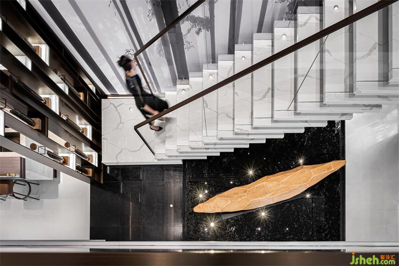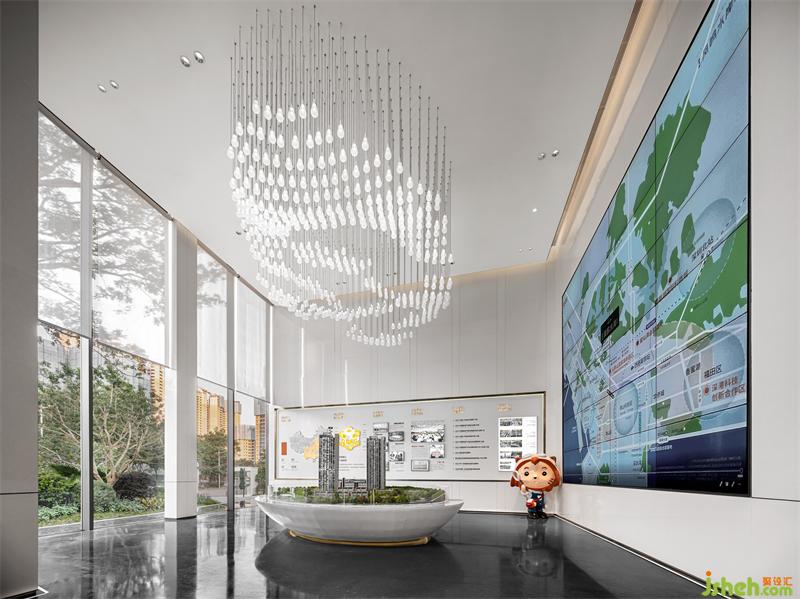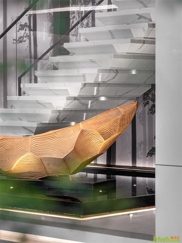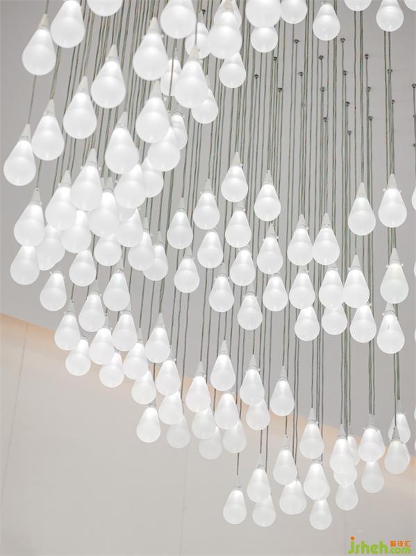 ”急雨才收翠色新,长青树上露沉沉,迷蒙白雾轻如许,欲上秋空作暮云“——寂莲法师。水滴形渐变光艺术吊灯,意若南方林间小雨,温润大地万物,水生万物,带来希望与未来。