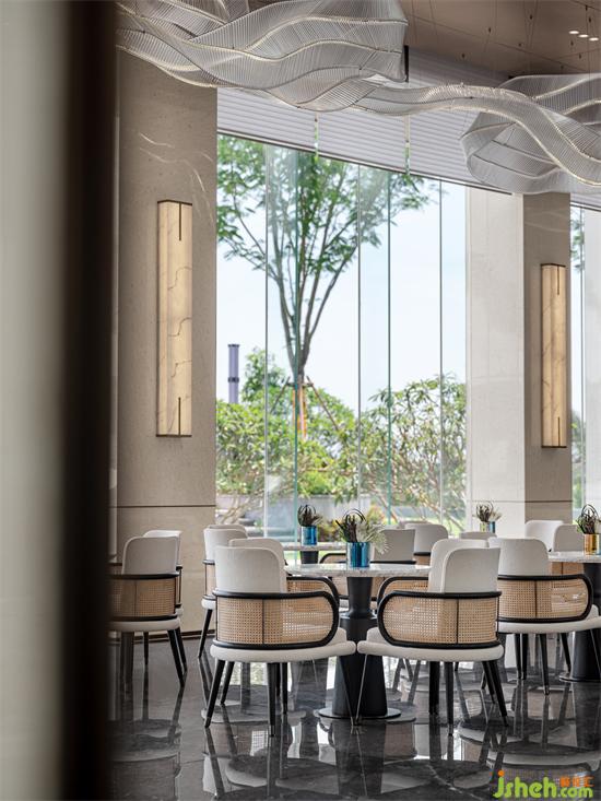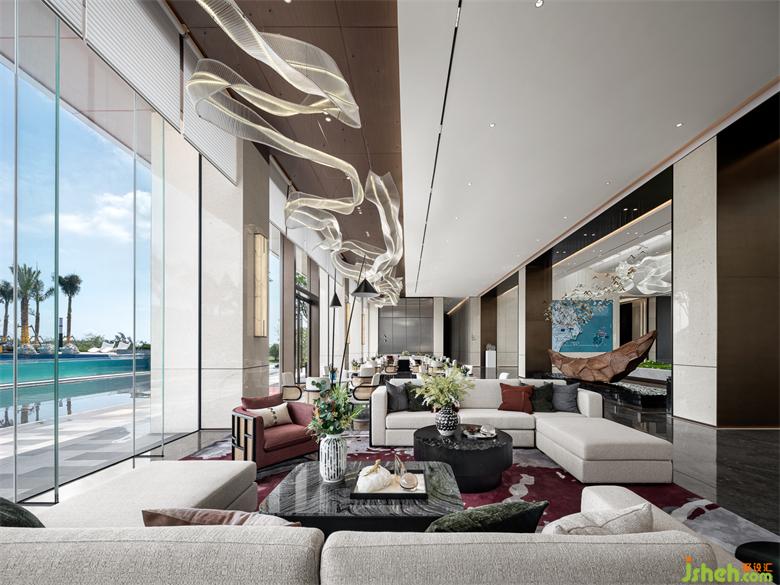 整个空间与户外景观融合,用静水、倒影与建筑的对话,招商体验中心设计来呼应项目的本身的气韵利用深邃的暗殊砂红色新东方艺术和藤棕天然材质点缀其中,强调连贯性的同时塑造出更深层次的视觉体验。