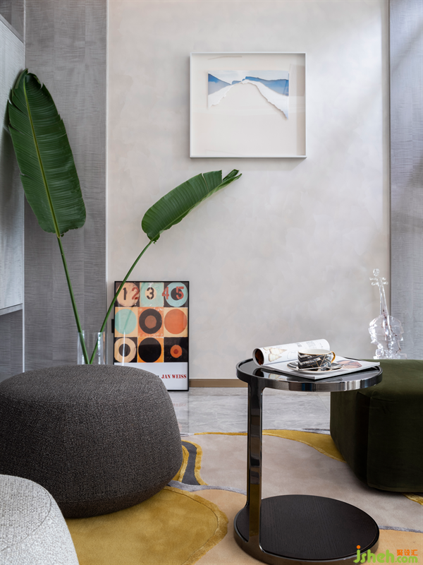 休闲区是公共区域和私人空间的过渡区域,设计师充分利用打造成一个小小的儿童娱乐天地。硬装的灰色大理石和柜体,沉稳却缺少了一丝生气。所以软装则以饱和度较高的色彩为主色调,为空间增添了几分活跃的色彩,异形的地毯、创意的摆件、有趣的抱枕、多变的挂画让整个空间的氛围轻松愉悦。闲暇时与孩子在这里共度难得的亲子时光,幸福温馨。