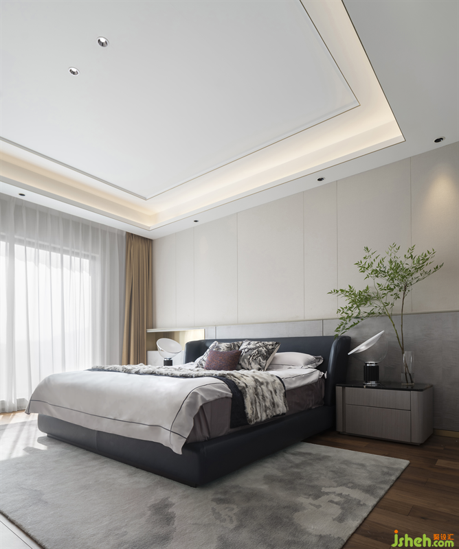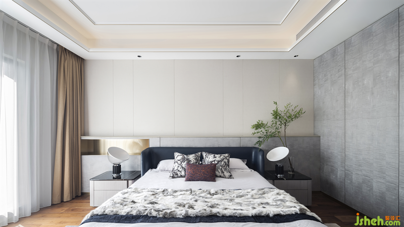 主卧空间大气、稳重,与业主本身的气质相得益彰。别墅装饰色调中有轻松的灰白色、稳重的深蓝色、柔和的芥末黄,虽是互补色却能很好的和谐共生,家具造型简洁却气场强大,共同打造出舒适、轻奢、高雅的空间状态,彰显居者的精尚品位。