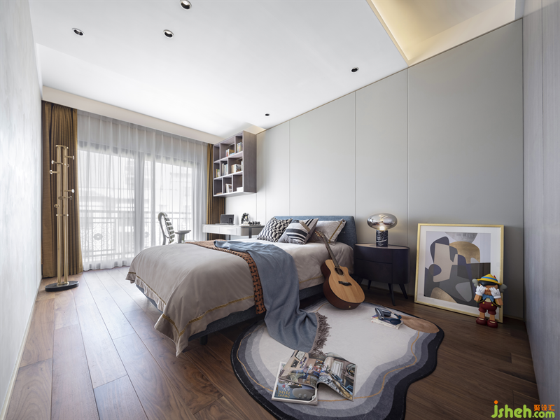 纯净的蓝色、热烈的橙色,演绎出正值青春年少的纯净与活力,乐器、耳机及潮玩摆件碰撞出一个有趣的艺术世界,大儿子房的设计自由且充满活力,就像我们的青春没有过多的约束,未来充满无限的可能。