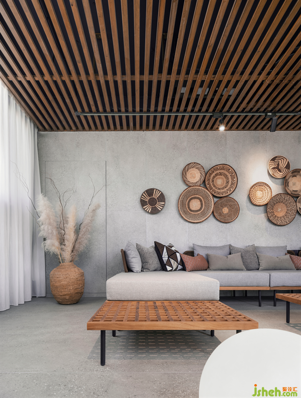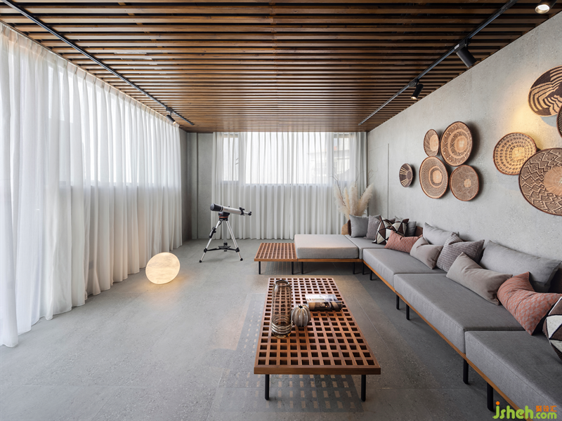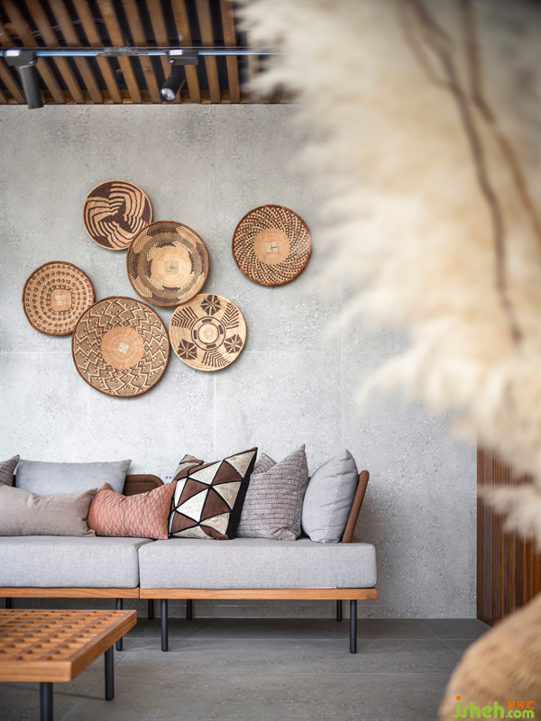 三楼是休闲厅和户外花园,区别于一楼和二楼的严谨,三楼的氛围是更加休闲、放松的。别墅装饰舒适的L型沙发与极具设计感的镂空茶几,搭配纯手工编织的壁饰营造出独特的异域风情,与三两好友闲坐于此,享受惬意的休闲时光。