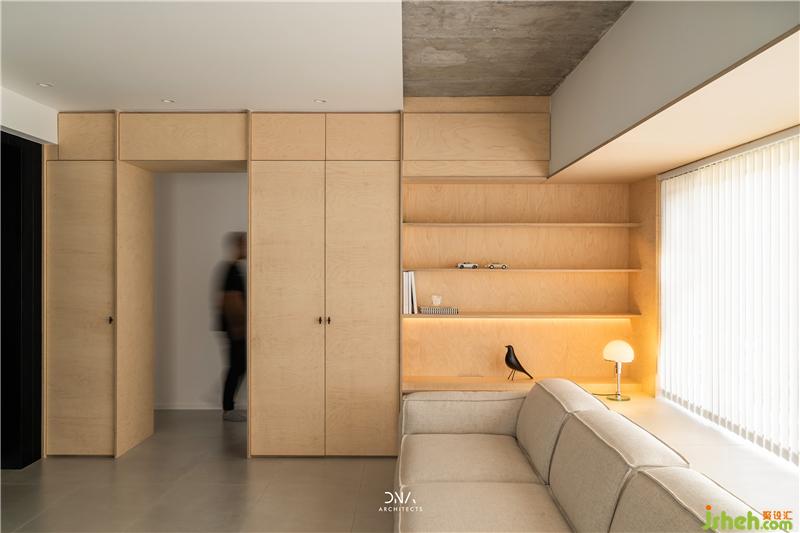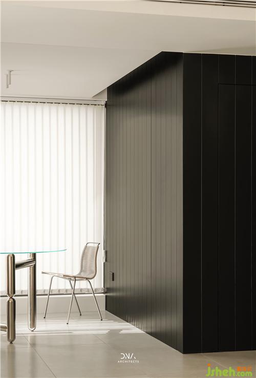 立面材质以黑色、灰色、木纹三个主要块面来快速划分不同的功能区,并设计了大量的隐蔽收纳,来维持外部整洁性。
