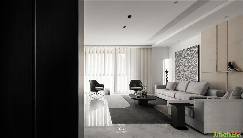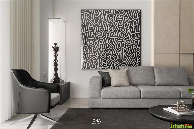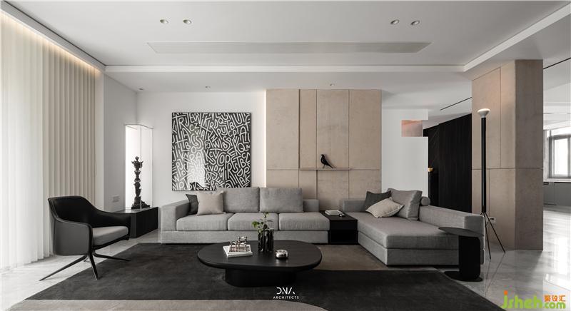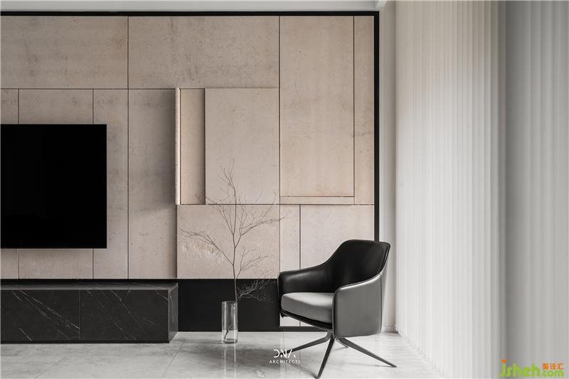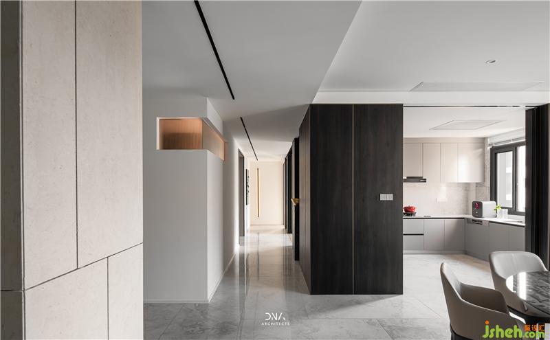 将北侧书房的墙体打开引入光线,消除长过道带来的幽闭感,杭州装修设计同时墙面深浅对比的材质清晰地划分出动静分区。