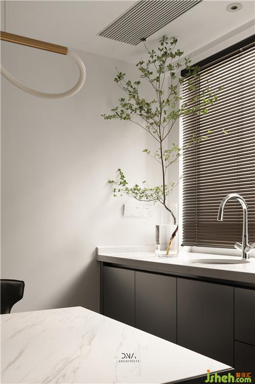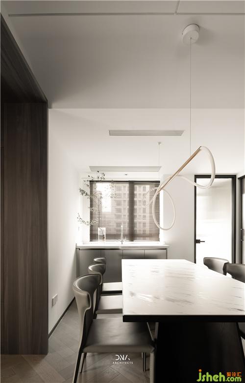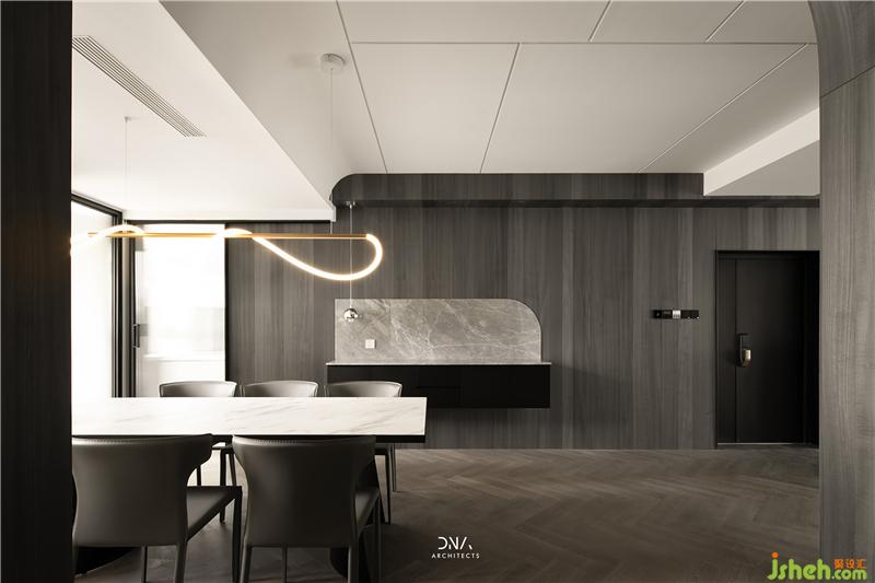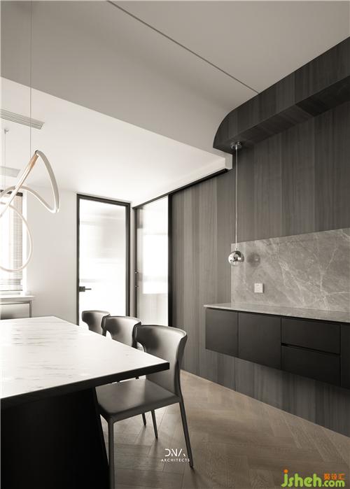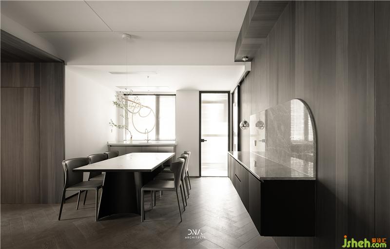 餐厅在水吧台餐边柜的半包裹的围合中,借由长虹玻璃让餐厅和厨房和谐衔接。