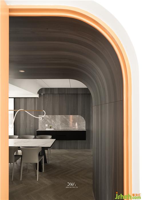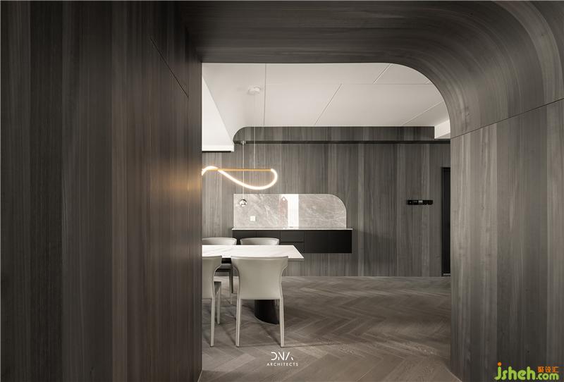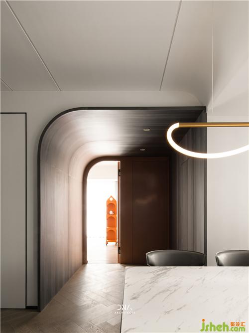 入门以定制木纹的木饰面连贯至餐厅主墙,凝练出简朴温润的气息杭州装修设计。悬挑的餐边柜,呼应的圆弧造型,作为玄关与餐厅空间的中介量体。