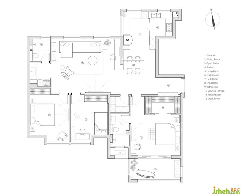 该项目是位于杭州市的150平米公寓,方案中最大的改动是将北面采光较差的两间客房墙体拆除,融合过道空间后形成宽敞方正的空间体量,同时通光量也大幅提升,我们将之与客厅位置的进行转换,很大程度上改变了原有空间关系和生活动线。此外,通过主次卧的转换为空间增设了独立的储物间,北阳台内包设置中西厨分区,公卫干湿分区等一系列措施将改善型住宅的配置进一步提升。