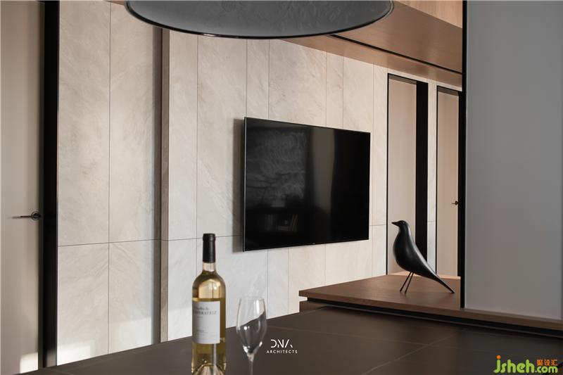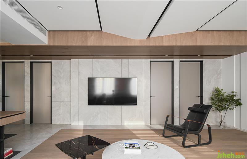 空间为表达简洁明快的视觉,材质的使用上追求连贯而分明。杭州室内设计师墙面温润的石材纹理,顶面天然的胡桃木纹,划分了空间主要的两个块面。