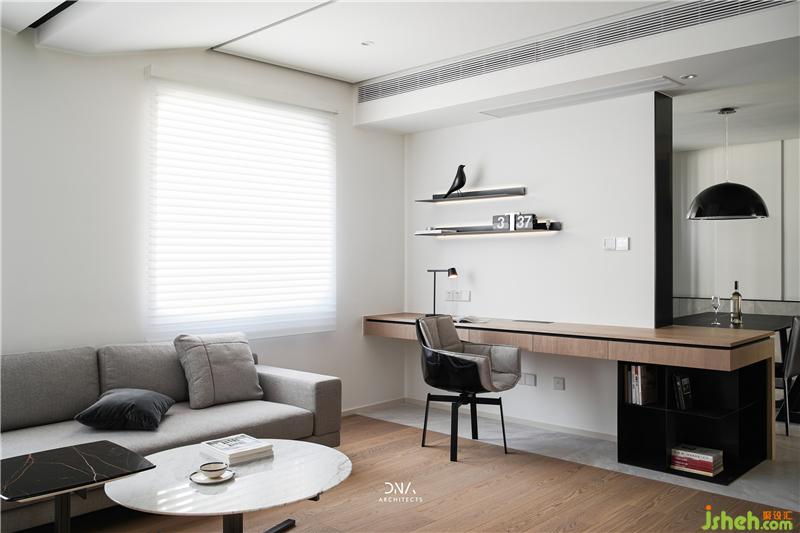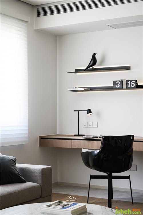 原有承重墙体阻隔了客、餐厅,产生了生硬的空间关系。为满足屋主的轻度办公使用杭州室内设计师,将书房置于客厅一侧,将水平面向餐桌延伸,起到整合多样功能、模糊空间界限的作用。