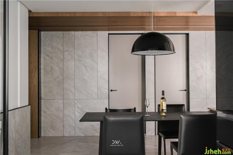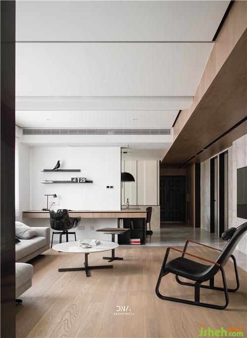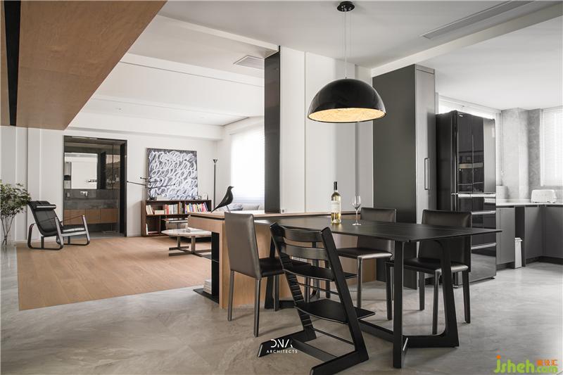 从客厅望去,视线停留之处,立面层叠了各个功能区。