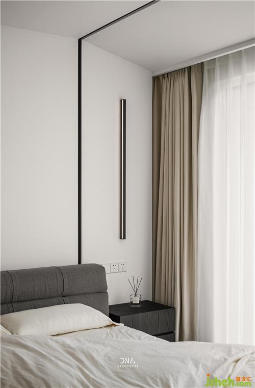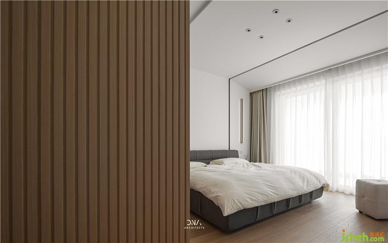 以白色和木色两种简单的材质来表达整个卧室空间的安静、平和,加以强烈的线条感来进一步刻画细节轮廓。