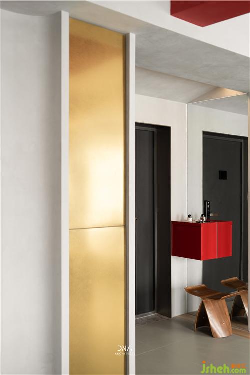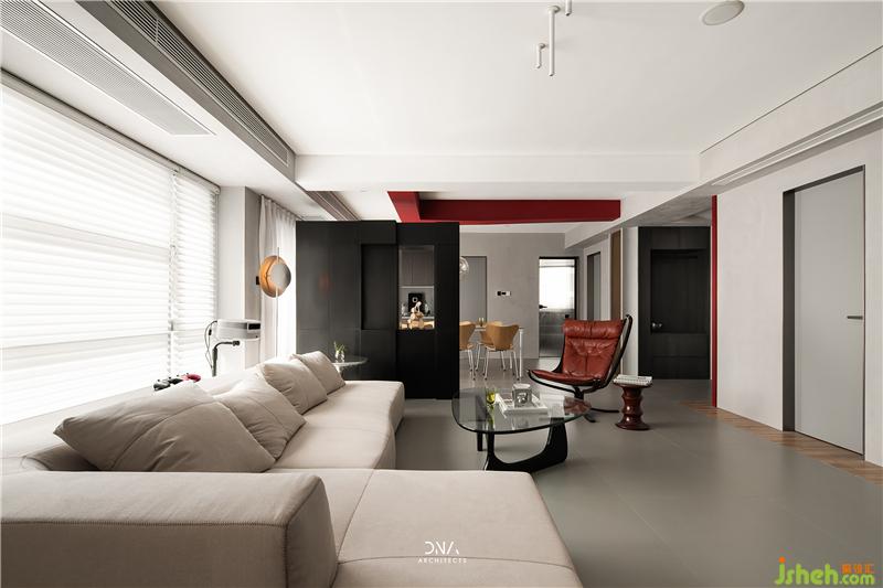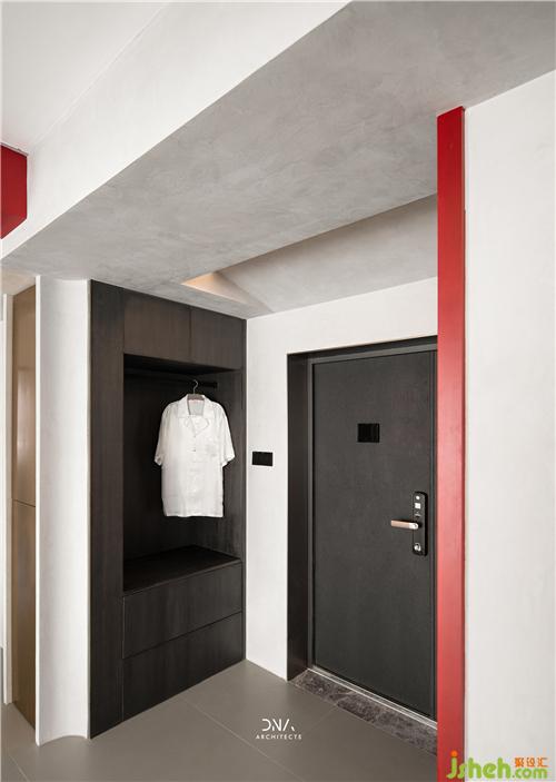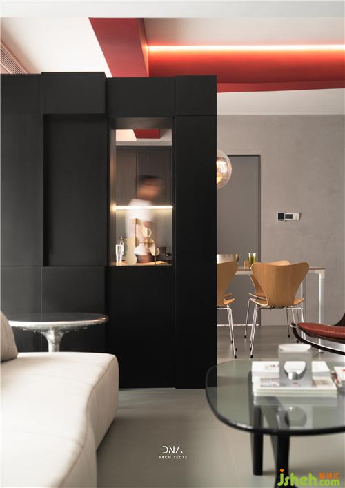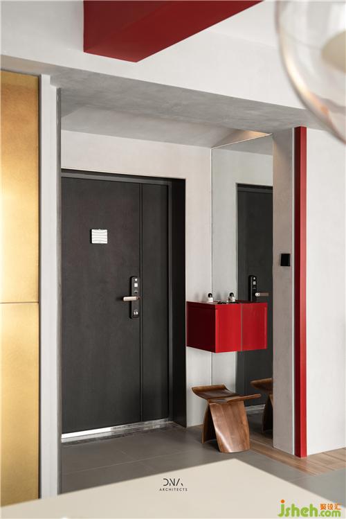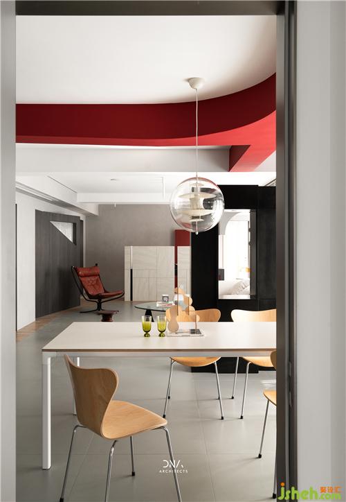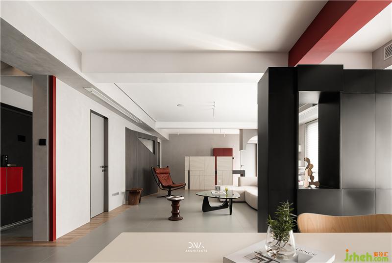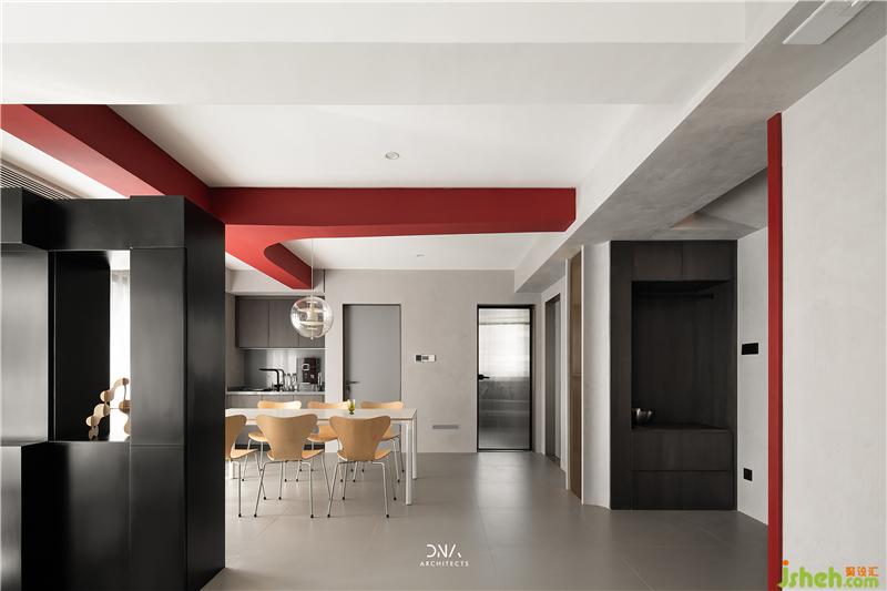 不规则的几何线条互相结合,无装饰的立面造型,红与黑的对撞色构成了一个自由开放的几何平面,为空间奠定了风格基础,为其注入了热情和温度。