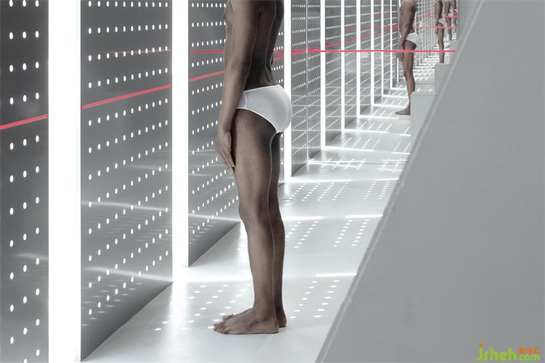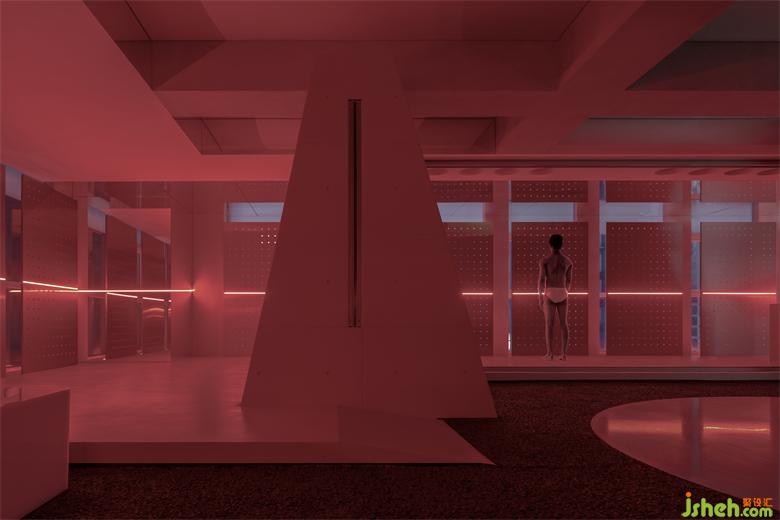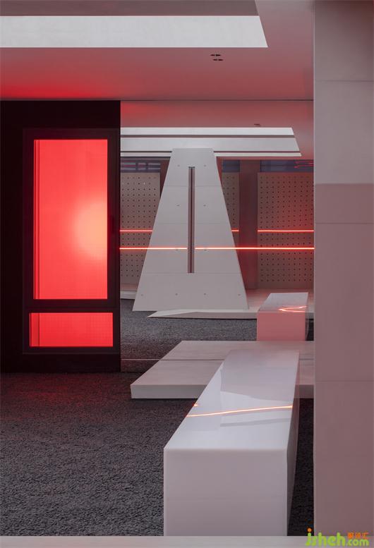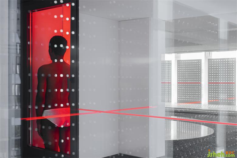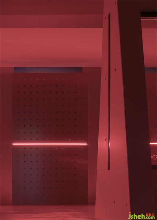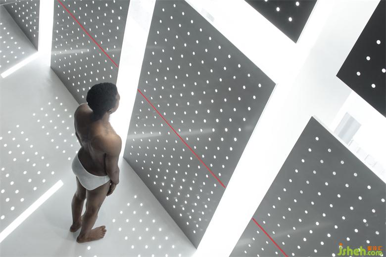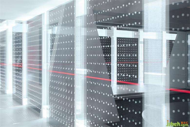 冲孔铝板的存在建立了更直接的屏障去实验内外的相对性,同时它是光影的途径,展厅设计是将阴影的形状和明暗的交替给直接表达给我们的载体。