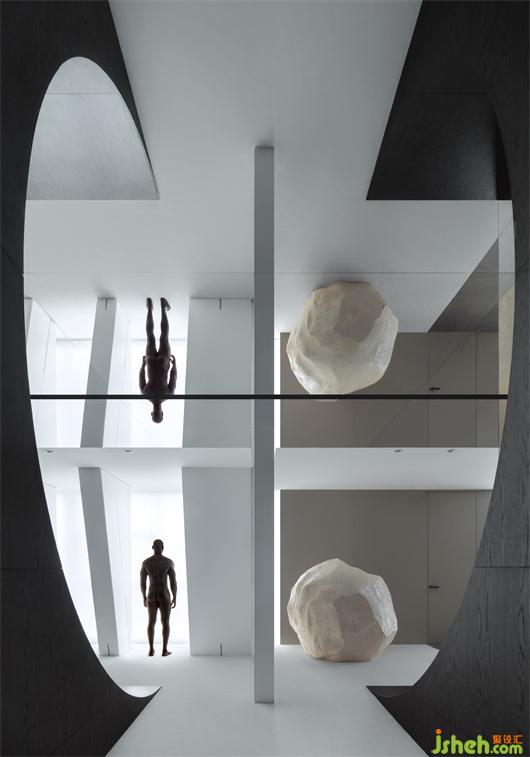 入口处,我们用象征自然山体的不规则三角柱体构建玄关及过道,通过顶部的镜面折射,扩大空间面积,营造悬浮错层的空间氛围。以带来观者空间体量感受上的挤压再释放,通过形态与收纳功能的结合来改变大家对于家用玄关的惯性思维。