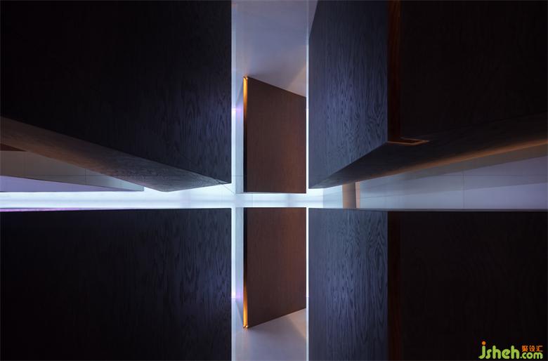 At the entrance, we use irregular triangular pillars that symbolize the natural mountain to construct the entrance and aisle, and through the top mirror refraction, the space area is enlarged, and the space atmosphere of suspension is created. In order to bring the squeeze and release of the viewer's space and feel, through the combination of form and storage function, we can change everyone's inertial thinking about the home entrance.