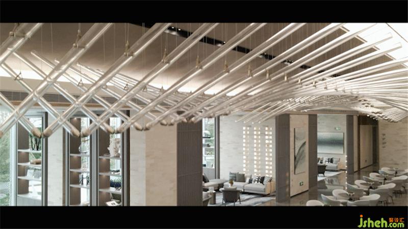 洽谈区的机械互动艺术装置《未来之桨》用科技赋能,让参观者以天花为船,融时空于水,踏上地板,前后走动时,荡起光线的浆,移步换景。目之所及,是山海艺术会馆的奇思妙想,像鲲鹏潜碧海,泳沧流,游弋于物外,思考在其中。“未来之桨”延续的是往日之精神,以科技之光载去更广阔的天地远航。