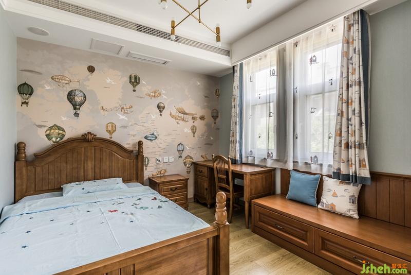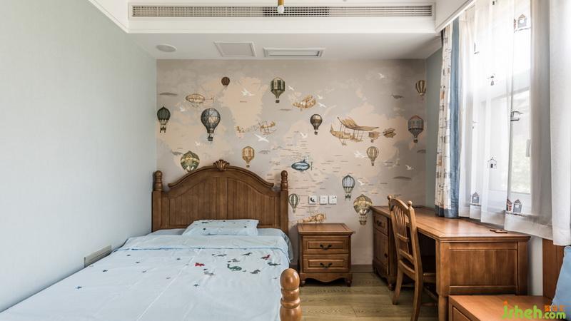 儿童房简洁明快,室内设计师选择冷色系和原木家具作为搭配。床头的背景墙采用了一个热气球的壁画,让孩子在这个空间充满童趣和想象的空间。