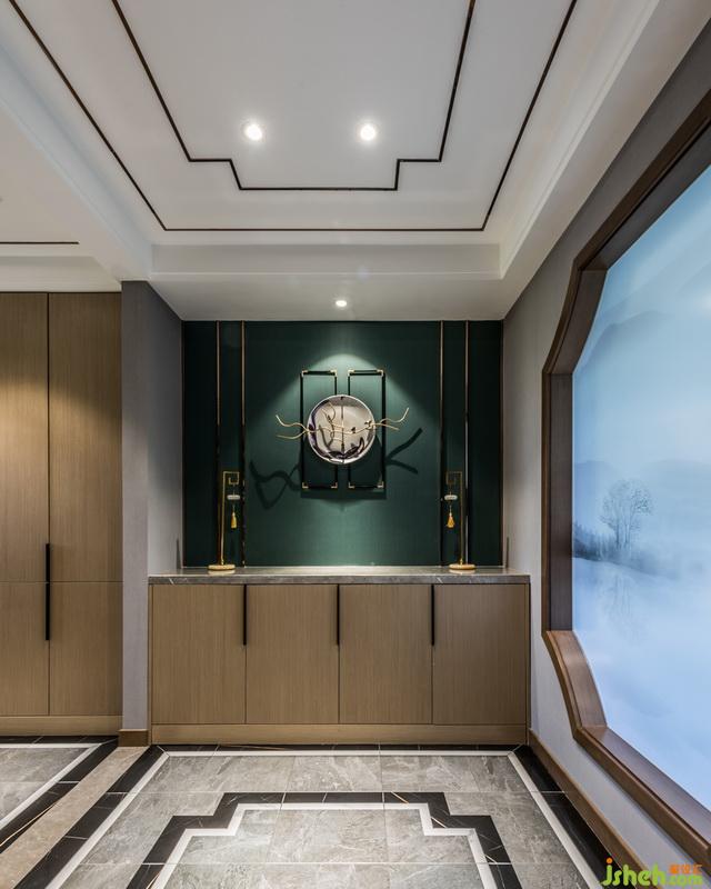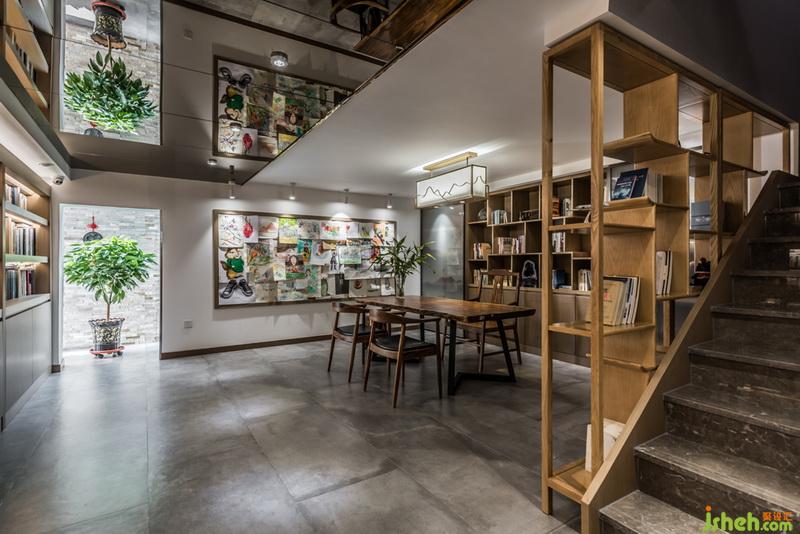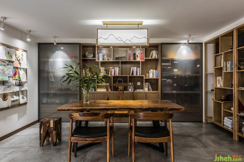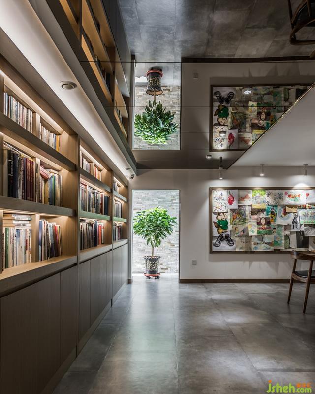 关于吊顶的设计室内设计师采用了茶镜,使原来层高比较矮的空间,让人的感受和视觉有所提升,同时也让整个书柜里的书镜像的吊顶上面,形成视觉上的冲击。