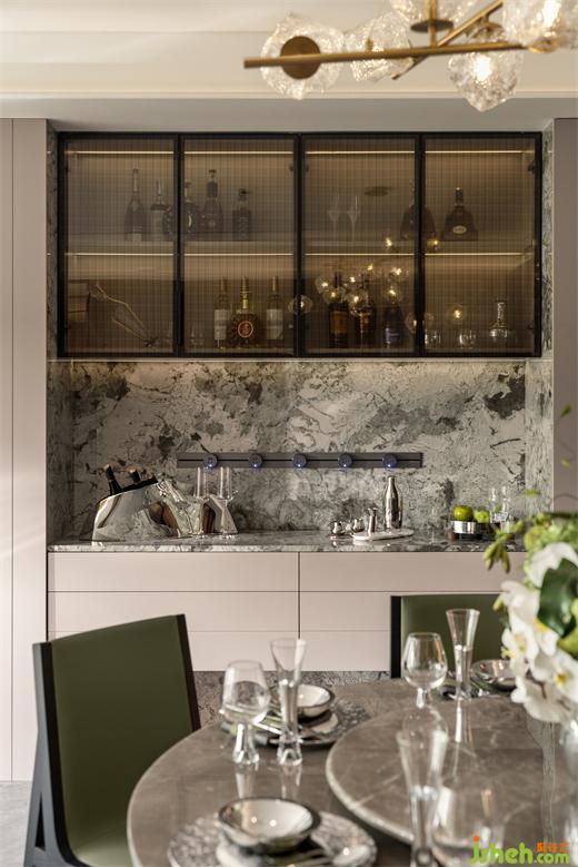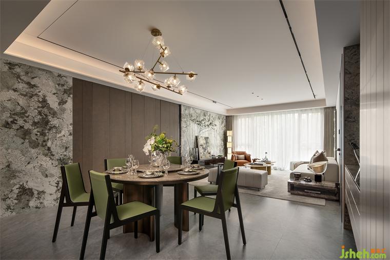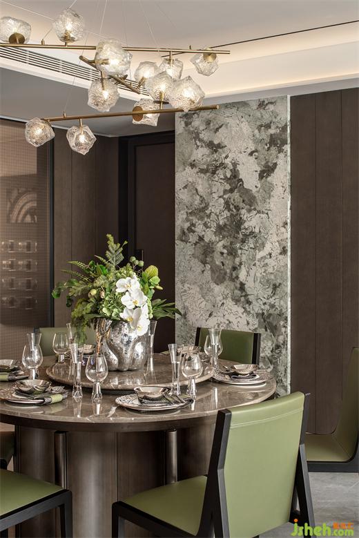 餐厅空间通透大气,一体式的布局设计让交流动线更加流畅。样板间设计大理石餐桌与墙面互相呼应,华丽和内敛的两极碰撞,留出恰到好处的余韵。生机盎然的绿色点缀其间,俗世寻常跃然纸上。