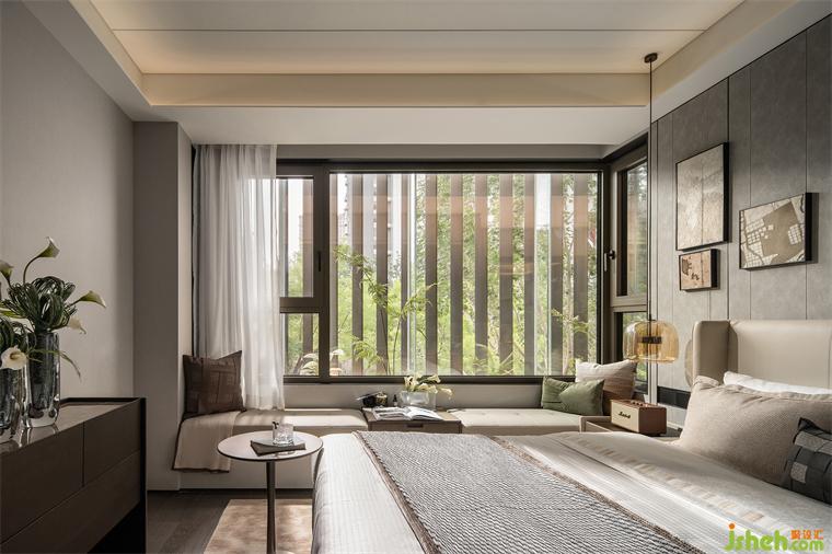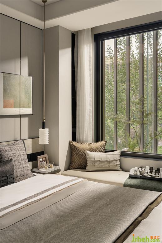 次卧低调含蓄的床头吊灯奠定空间基调,空间中材质肌理丰富却内敛,利用不同明度和色彩倾向的灰色赋予空间轻奢优雅的品质感。