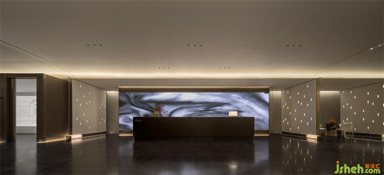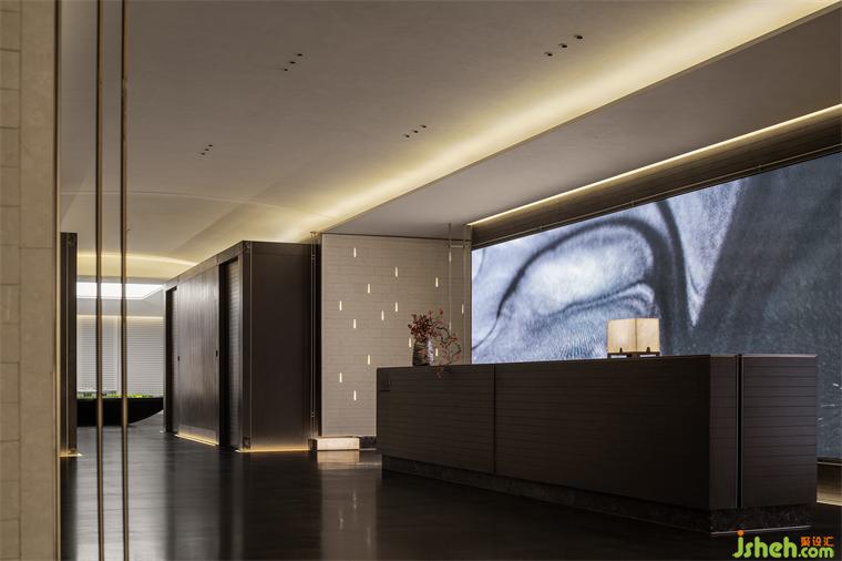 步入接待大厅,设计采用大量简洁、硬朗的线条勾勒空间,没有雕花或镶嵌的华丽,反而展现出流畅和开放的氛围。一抹东方墨色铺就空间底色,前台如同一方墨条横置于界面中央,以现代设计的手法展现了富有东方色彩的雅致与韵味。