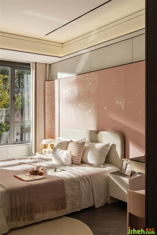进入女孩房,立马被一种温柔、浪漫的氛围所包围,室内色调以米白和粉色为主,背景墙设计手法一以贯之,空间氛围温馨自然。