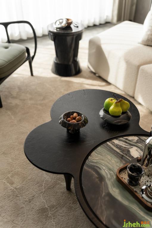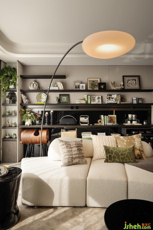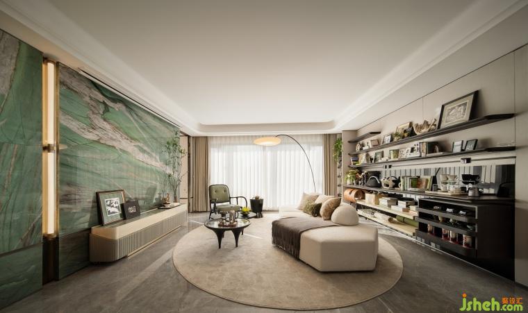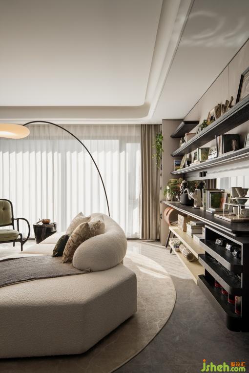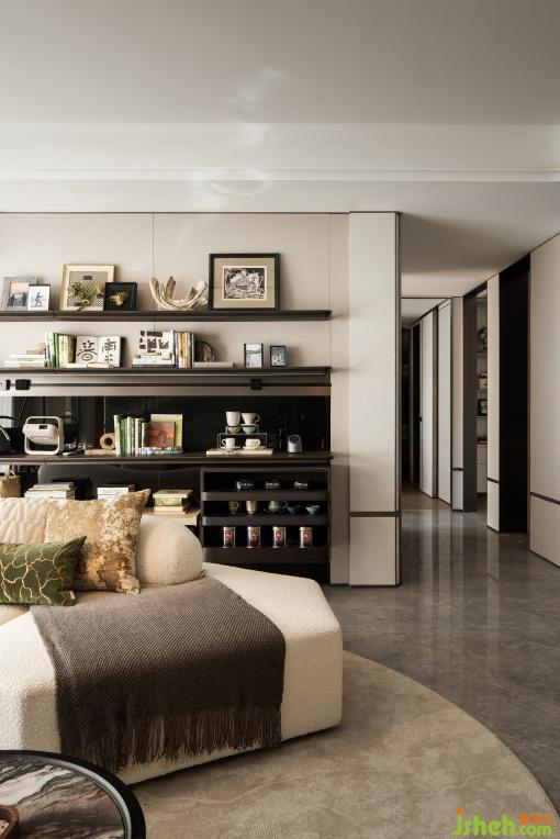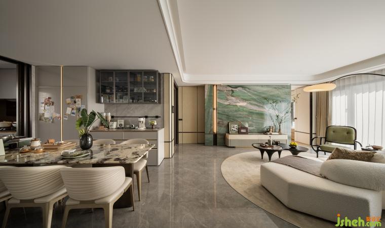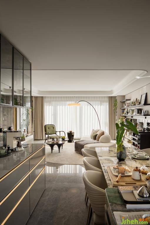 这是设计师为活力家庭量身定制的“生活剧场”。LDK一体化空间通过几何形沙发与灵活桌椅布置构建围合式交流场景,可自由组合为咖啡研磨角、观影空间或亲子游戏场。6米通厅打破传统边界,背景墙以玉石般的光泽和纹路折射出自然意趣,悬浮书架层展示收藏的杯碟、书籍与音响,功能与展示的边界在此消融。