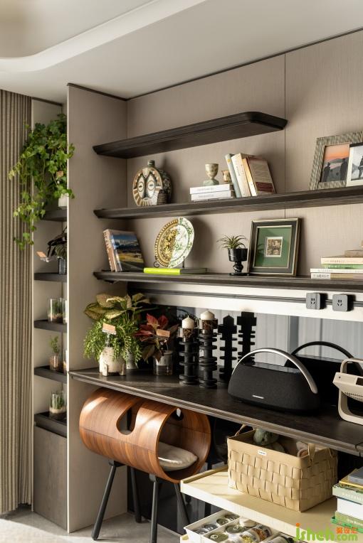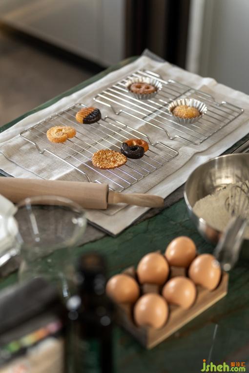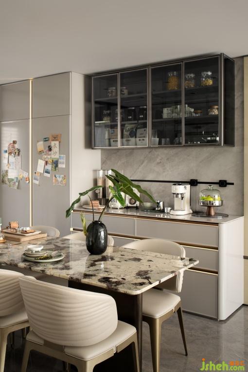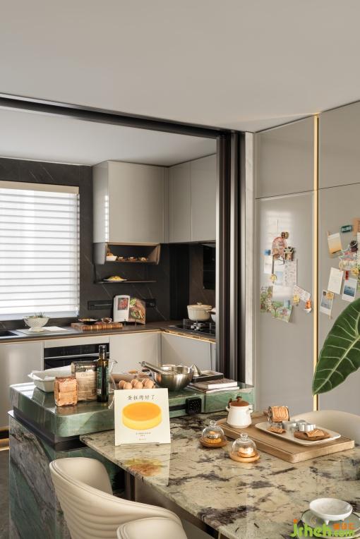 中央岛联动餐桌与西厨,将用餐仪式感与生活烟火气完美融合。大理石餐桌嵌套绿色岛台,咖啡机的香气与玻璃器皿的质感交织。餐桌在早餐吧、临时办公桌、亲子烘焙台之间无缝切换,空间成为一场持续进行的感官实验。