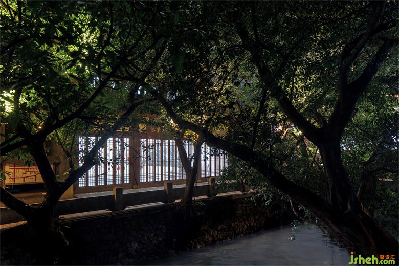 建筑主体位于安泰河畔与路道大榕树的交叉处,主入口必经安泰河畔,通过古式花格门隐约可见空间内部的轮廓,此时的建筑仿佛被赋予含蓄、谦逊的气质。