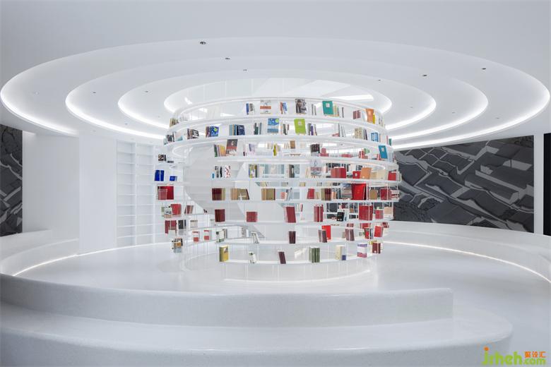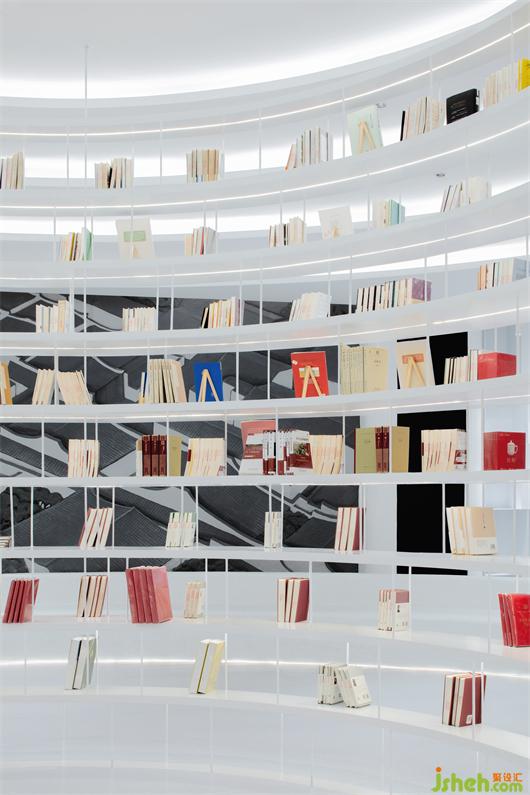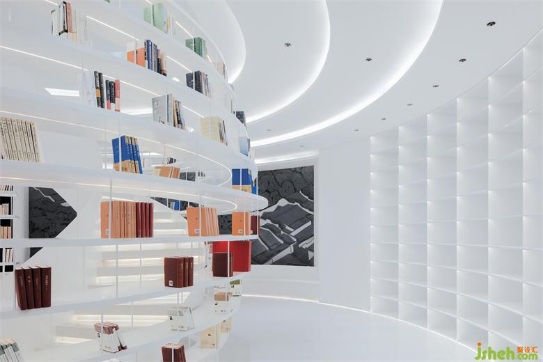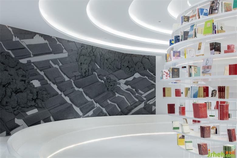 进入空间主体,中心位置的白色巨型球体瞬间进入眼球,整个空间提取“白”作为主色,古厝外建筑的灰色与内部空间的白色金属球体、白色墙面、米白色环氧水磨石地面、玻璃产生视觉强烈的冲突,全视野里跳出“一抹白”,同时凸显了三坊七巷建筑群俯瞰景的灰色墙面浮雕。