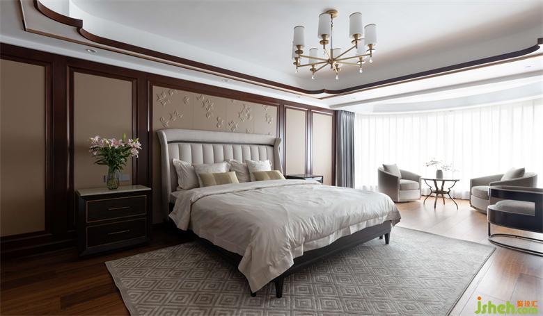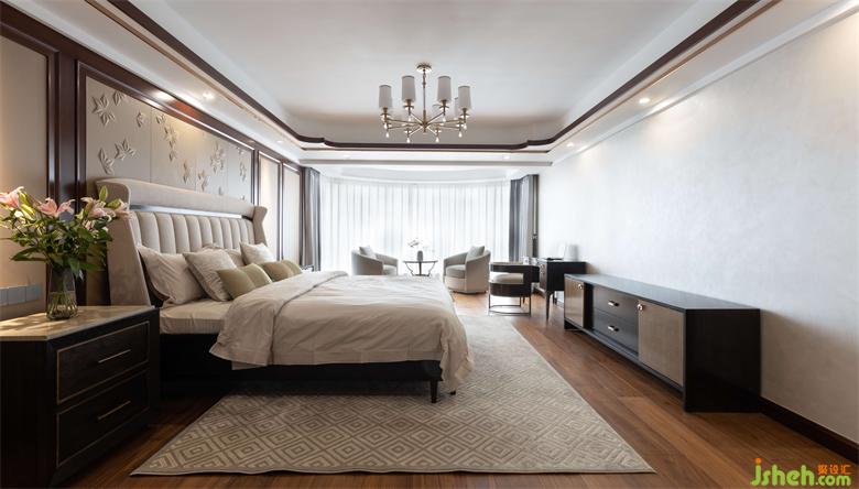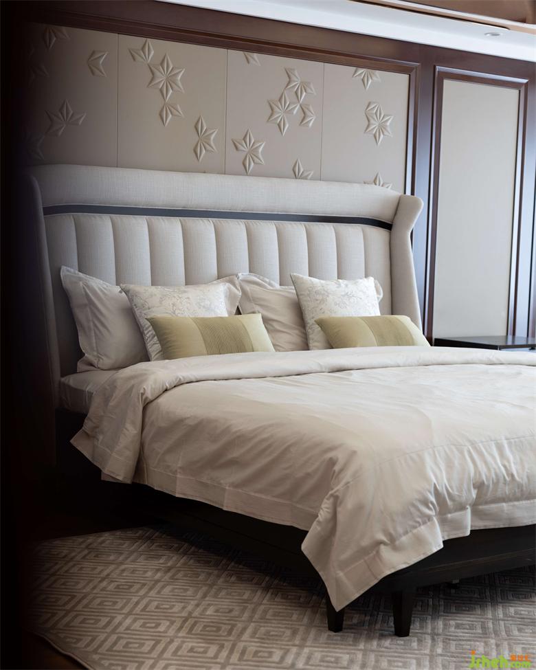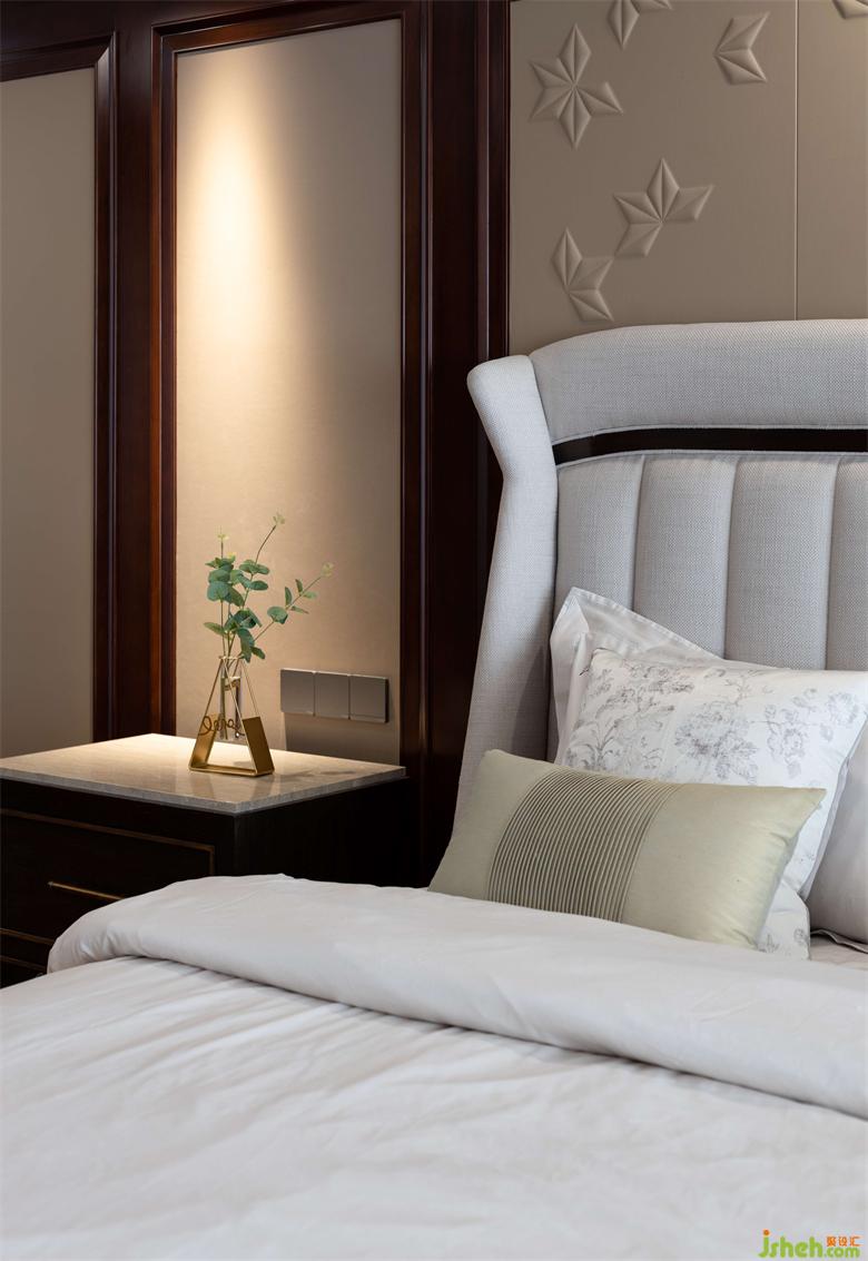 主卧整体色系给人一个温馨的空间,墙面大面积采取艺术漆、背景墙主体设计胡桃木护墙板,家居设计配合着现代感的浅色硬包,为整体空间奠定了简约时尚的格调。奢适的性能、精细的工艺,营造出大气舒适氛围的主人房。