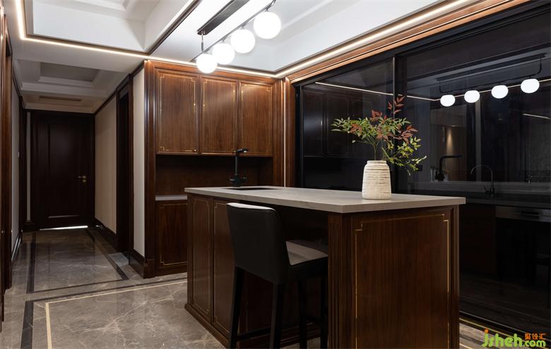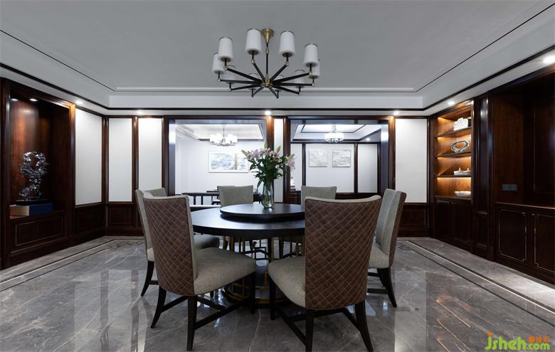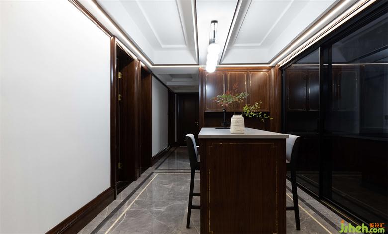 餐厅高端的美克A.R.T.实木圆形餐桌,家居设计通过与地面的平花大规格地砖,深浅色调的配色,表达出不同材质融合的魅力,使得每个家具独立而不孤立。顶墙酒水柜使用高端胡桃木的实木柜,兼具装饰、收纳的职能,内嵌的装饰画及装饰品,彰显主人轻奢的生活品味和格调。